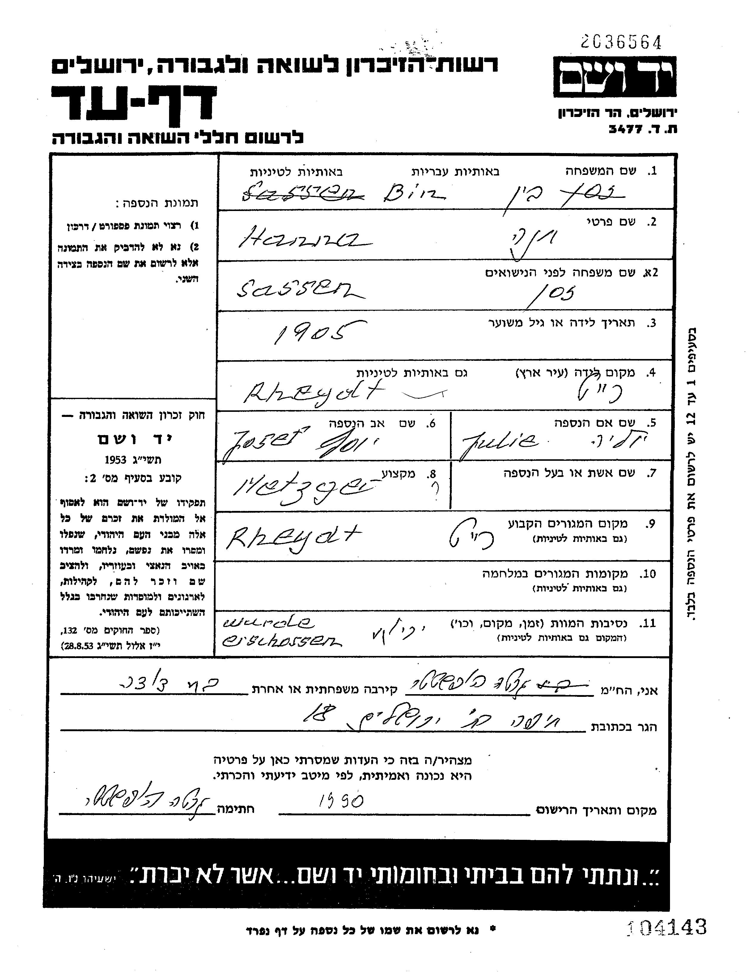Bin Hanna 1905 Rheydt, Germany Page of Testimony