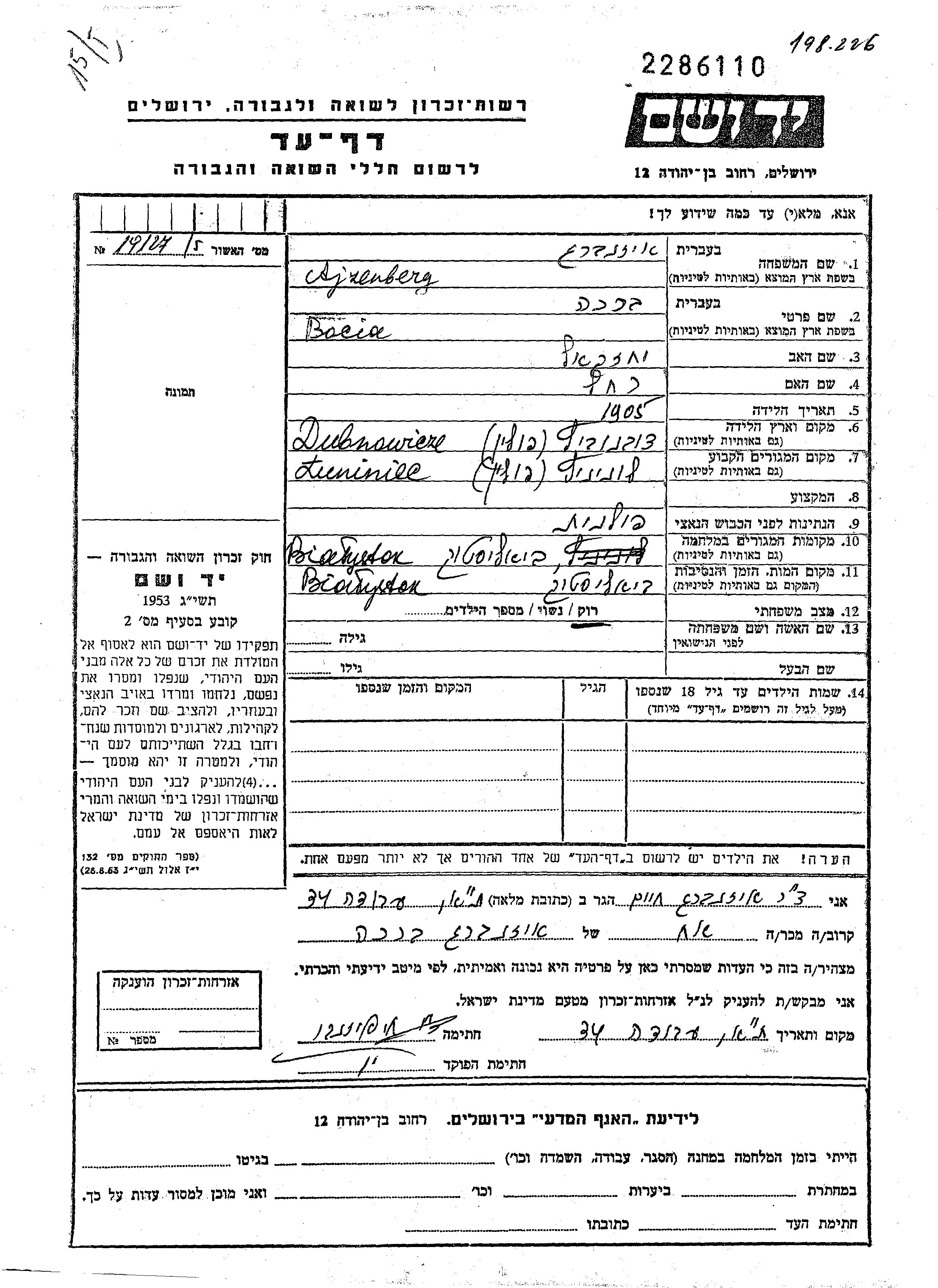 Bocia Brakha Ajzenberg was born in Dubnovichi, Poland, 1905 to Yekhezkel and Rakhel. She was single. Prior to WWII she lived in Luniniec, Poland. During the war she was in Bialystok, Poland. Bocia Brakha was murdered in the Shoah. Place of death: Bialystok, Poland.