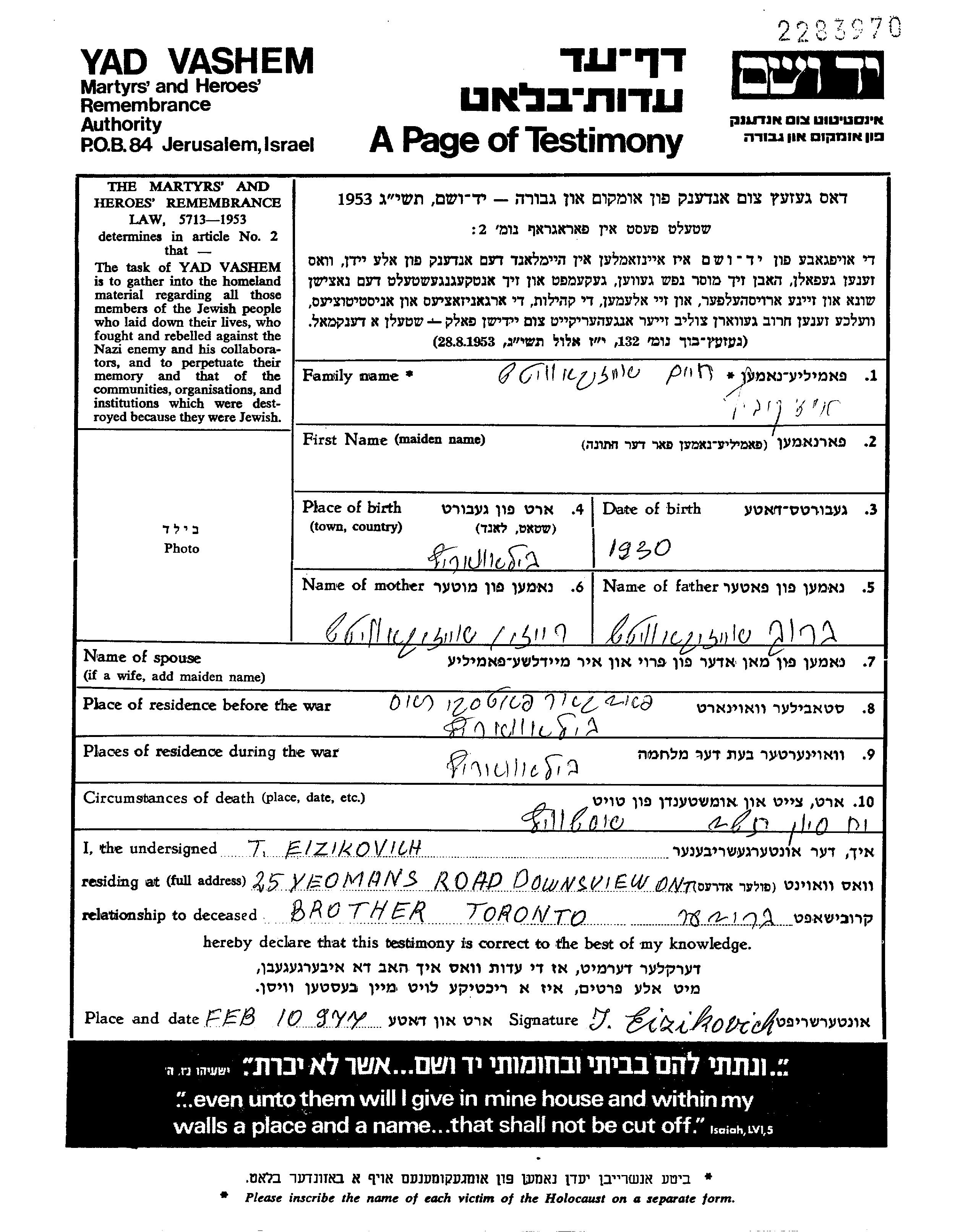 Khaim Eizikovich was born in Belovarec, Czechoslovakia, 1930 to Barukh and Reizi nee Froimovitz. He was child. Prior to WWII he lived in Belovarec, Czechoslovakia. During the war he was in Belovarec, Czechoslovakia. Khaim was murdered in the Shoah. Place of death: Auschwitz, Poland, 03/06/1942.