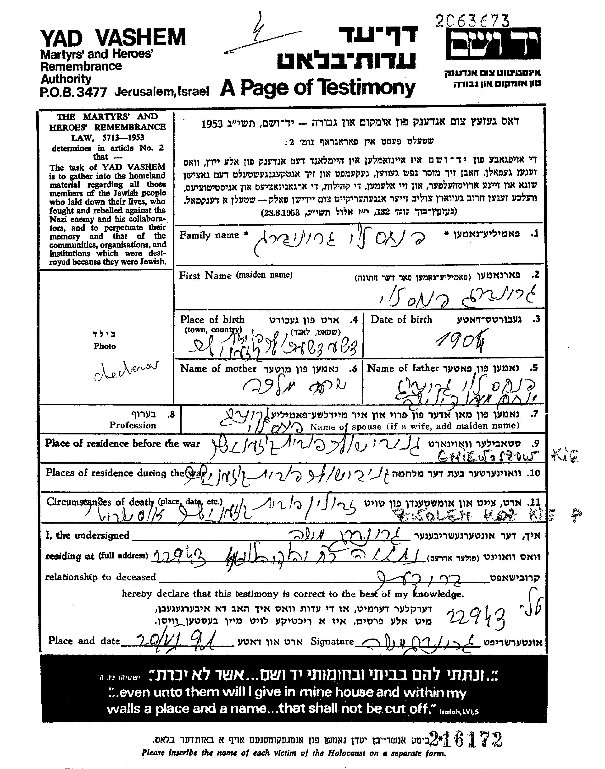 Pinkhas Levi Grinberg was born in Sieciechow, Poland, 1904 to Menakhem Mendel and Sara Malka. Prior to WWII he lived in Gniewoszow, Poland. During the war he was in Gniewoszow, Poland. Pinkhas Levi was murdered in the Shoah. Place of death: Auschwitz, Poland.