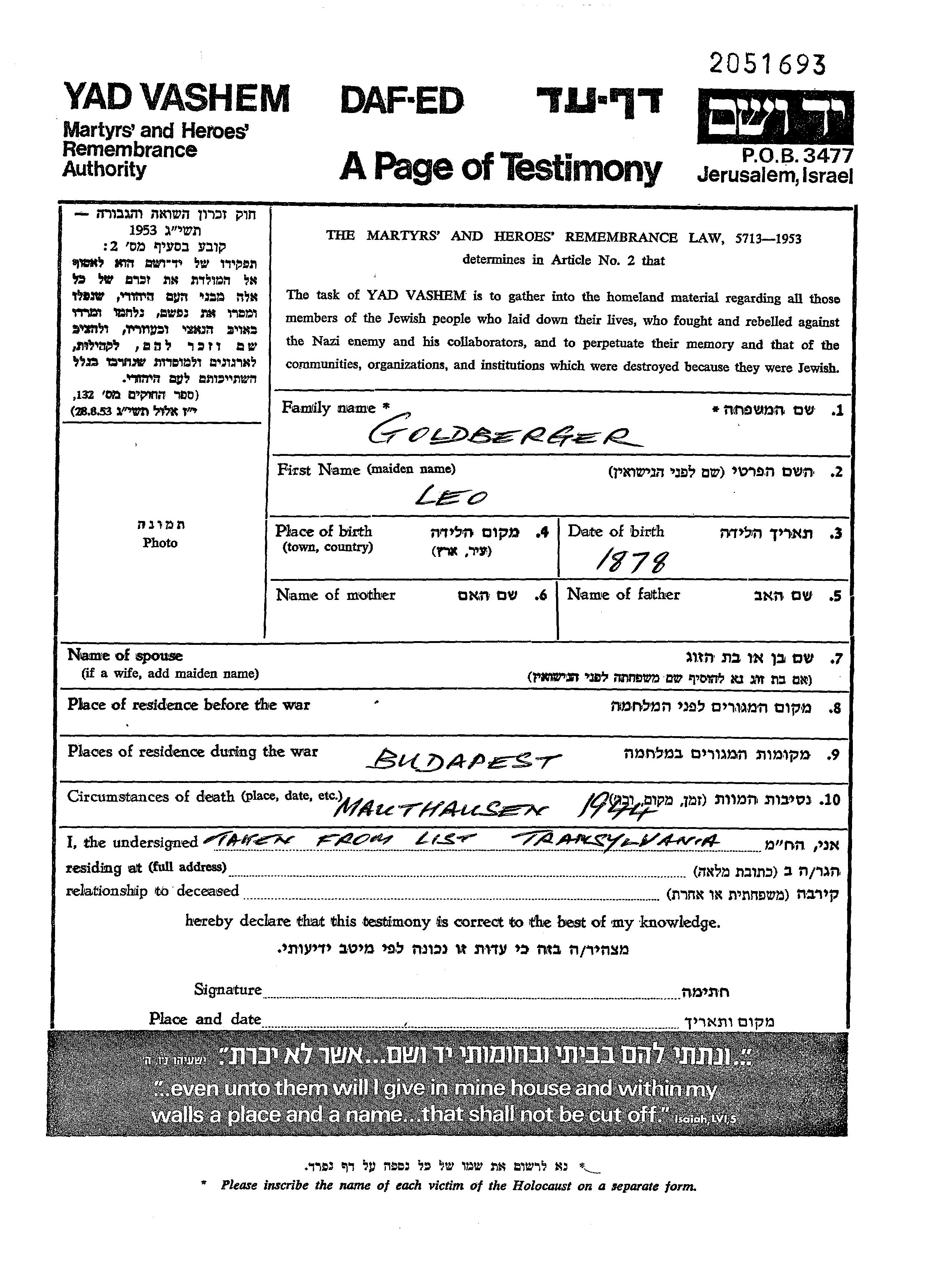 Goldberger Leo 1878 unstated place, Page of Testimony
