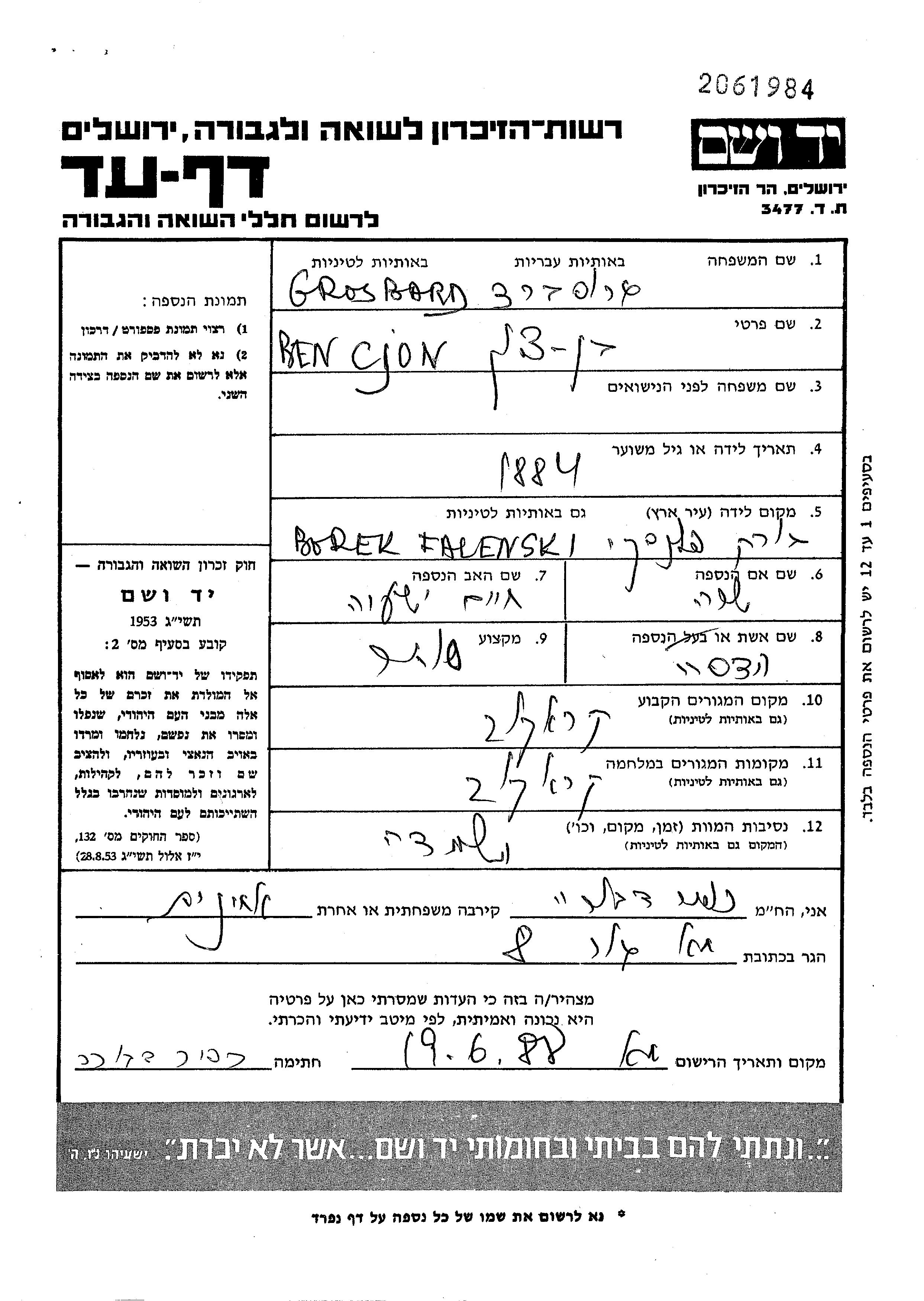 Ben Cjon Bentzion Grosbard was born in Borek Falecki, Poland, 1884 to Khaim Jsaja Yeshiyah and Sara. He was a merchant and married to Hadasa. Prior to WWII he lived in Krakow, Poland. During the war he was in Krakow, Poland.