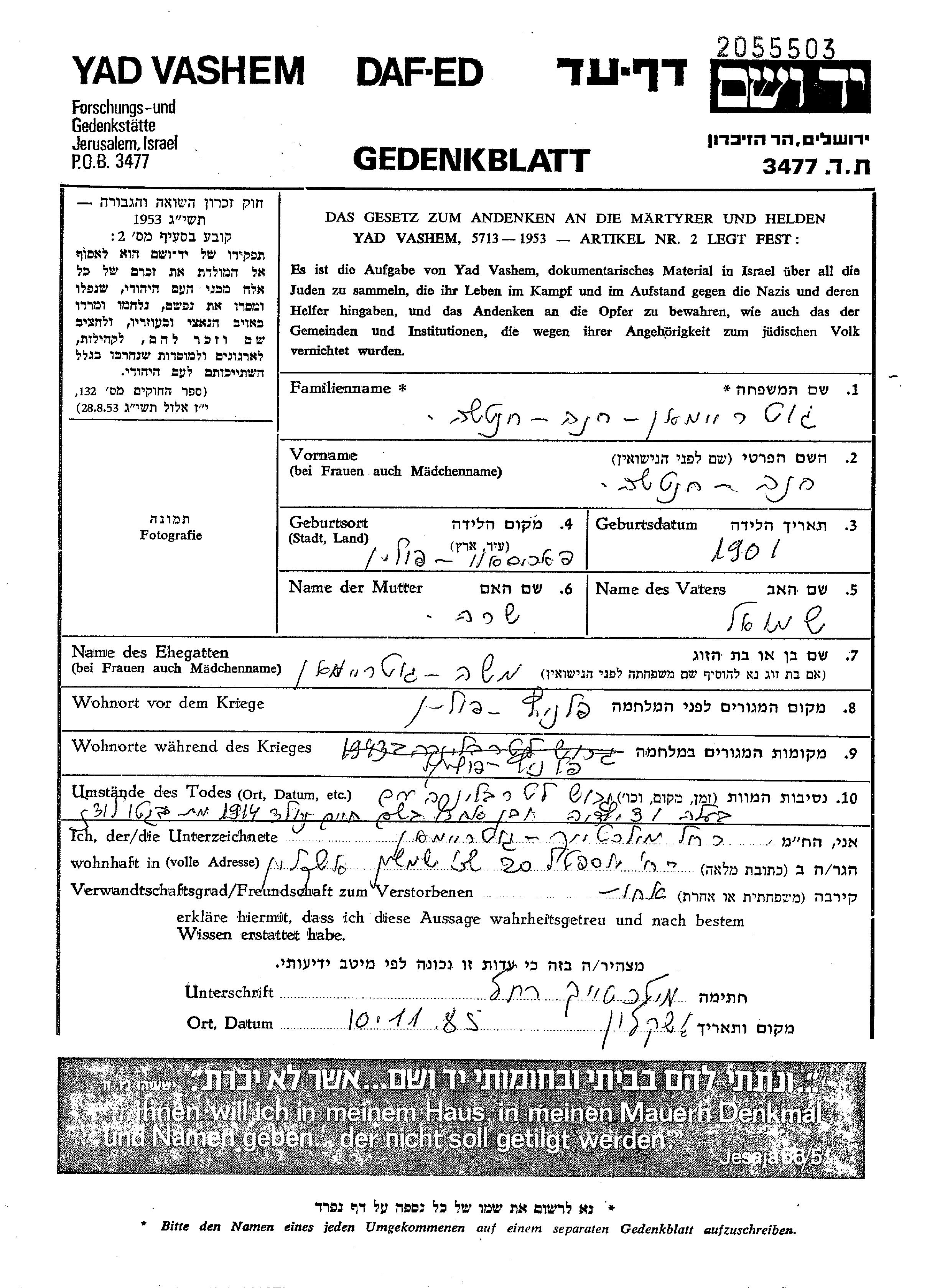 Khancha Gutreiman was born in Parysow, Poland, 1901 to Shmuel and Sara. She was married to Moshe. Prior to WWII she lived in Planic, Poland. During the war she was in Planic, Poland. Khancha was murdered in the Shoah. Place of death: Treblinka, Poland.