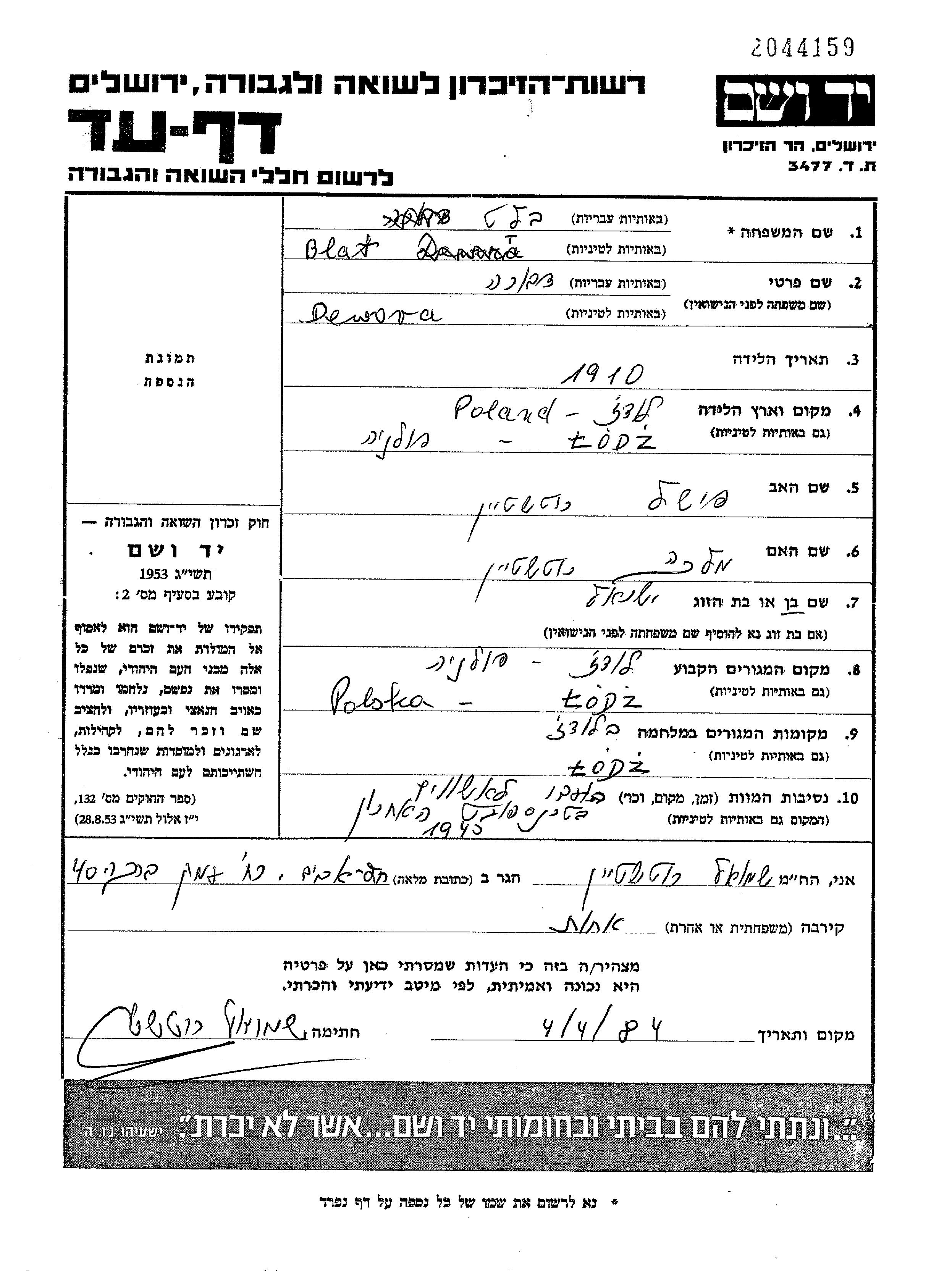 Blat Dewora 1910 Lodz, Poland Page of Testimony
