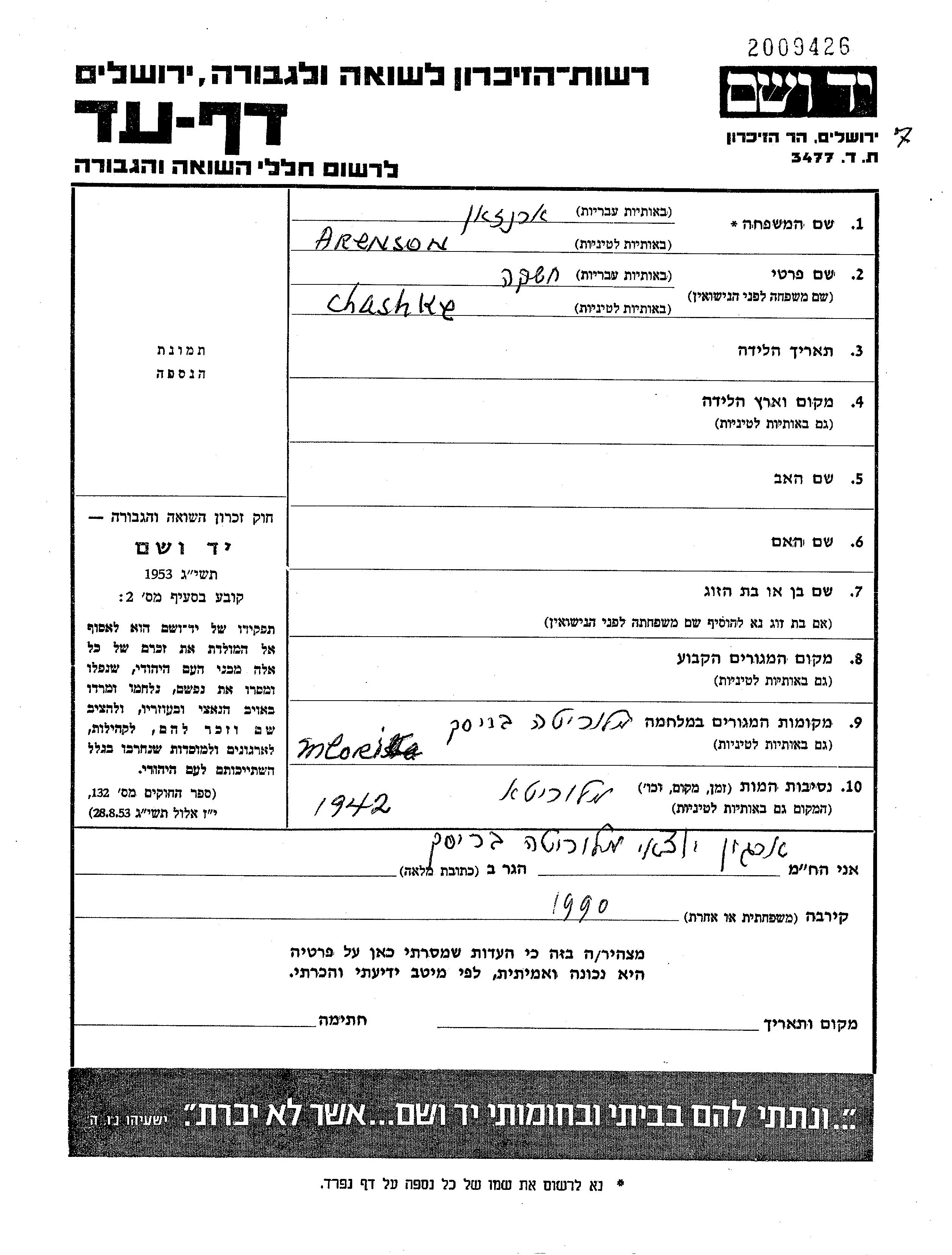Chashke Arenson. During the war she was in Maloryta, Poland.