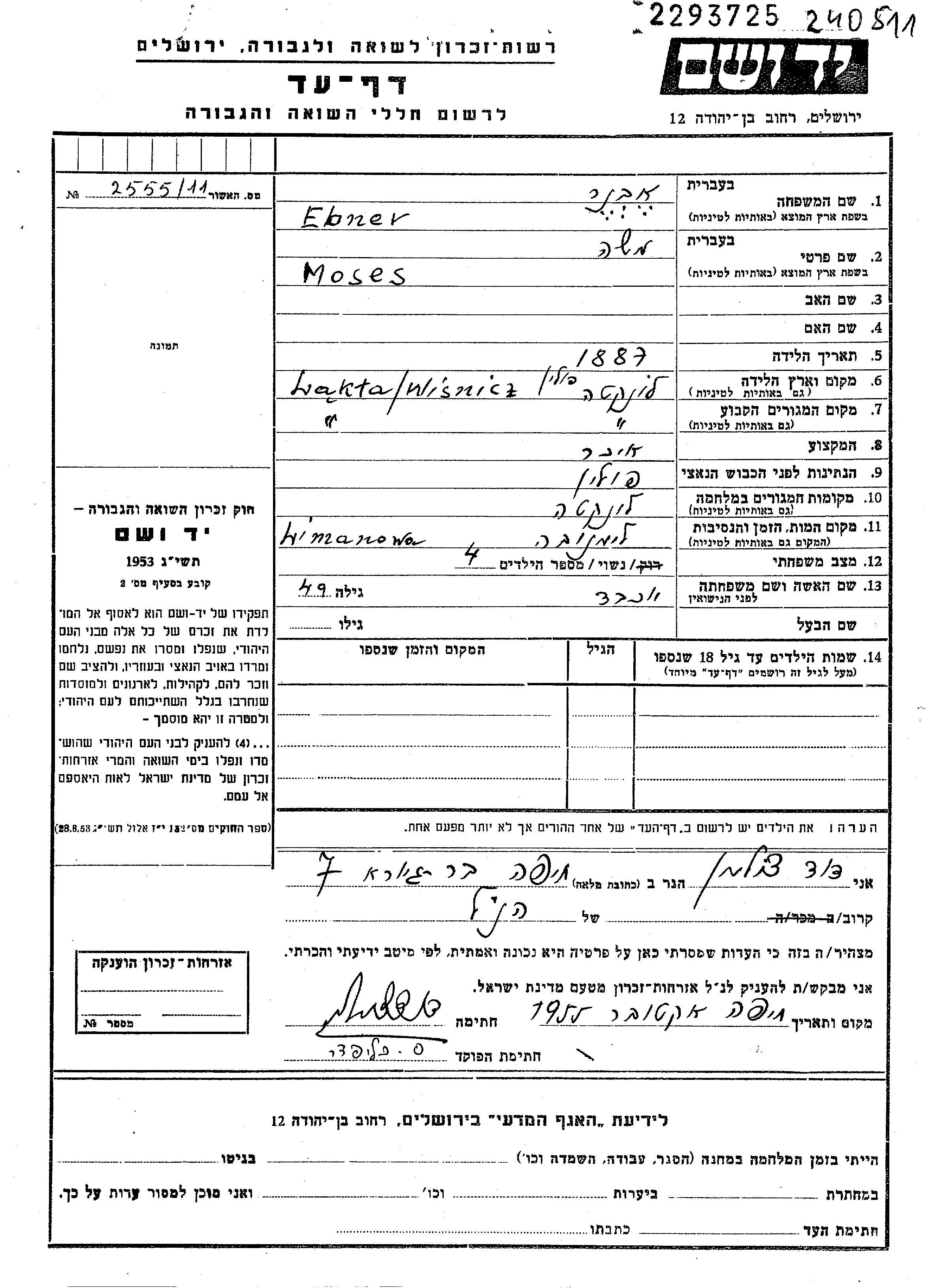 Moses Ebner Avner was born in Lakta, Poland, 1887. He was an agriculturist and married to Yokheved. Prior to WWII he lived in Wisnicz, Poland. During the war he was in Lakta, Poland. Moses was murdered in the Shoah. Place of death: Limanowa, Poland.