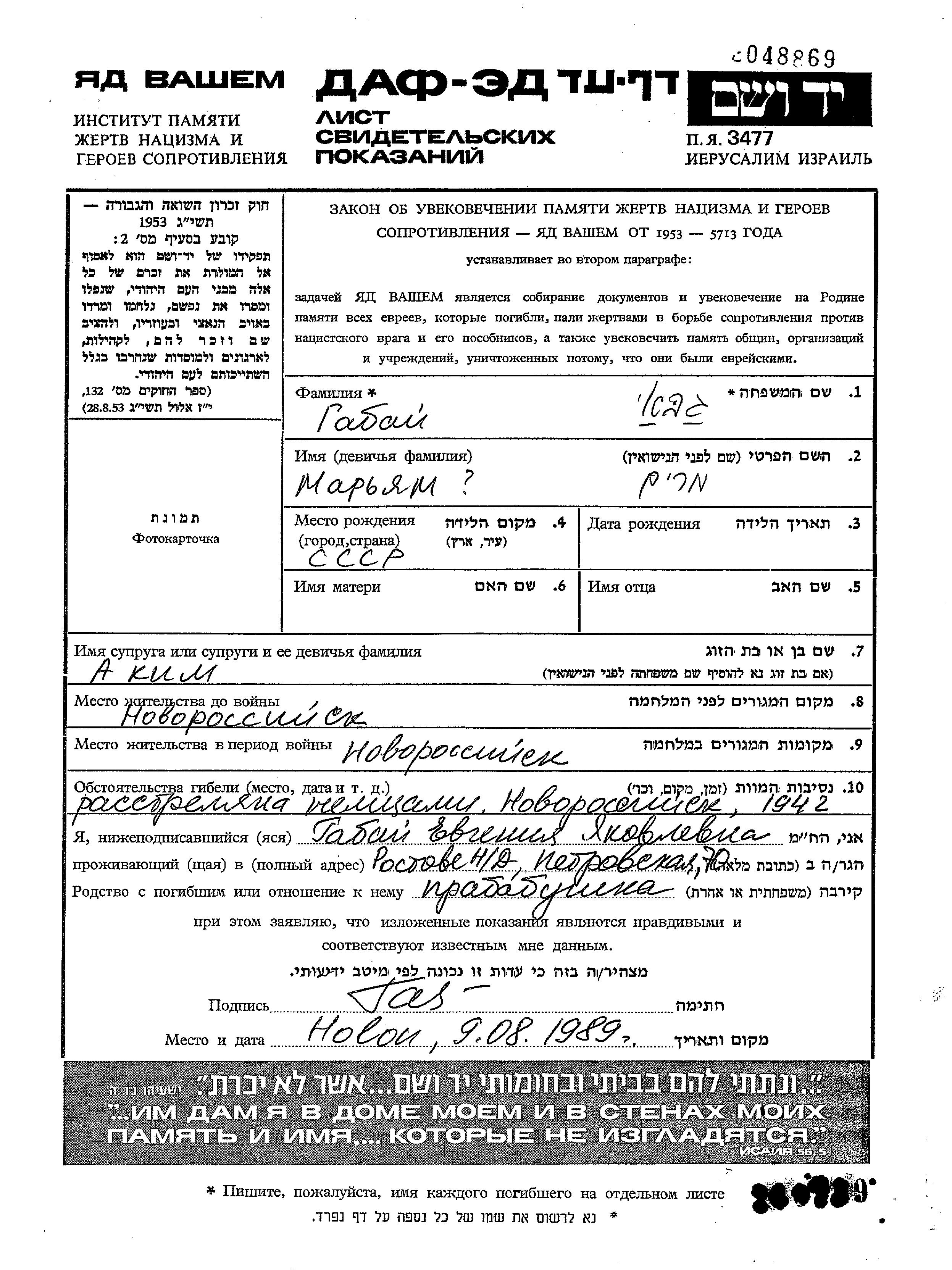 Miriam Gabai was born in Soviet Union. She was married to Akim. Prior to WWII she lived in Novorossiysk, Russia (USSR). During the war she was in Novorossiysk, Russia (USSR). Miriam was murdered in the Shoah. Place of death: Novorossiysk, Russia (USSR), 1942.