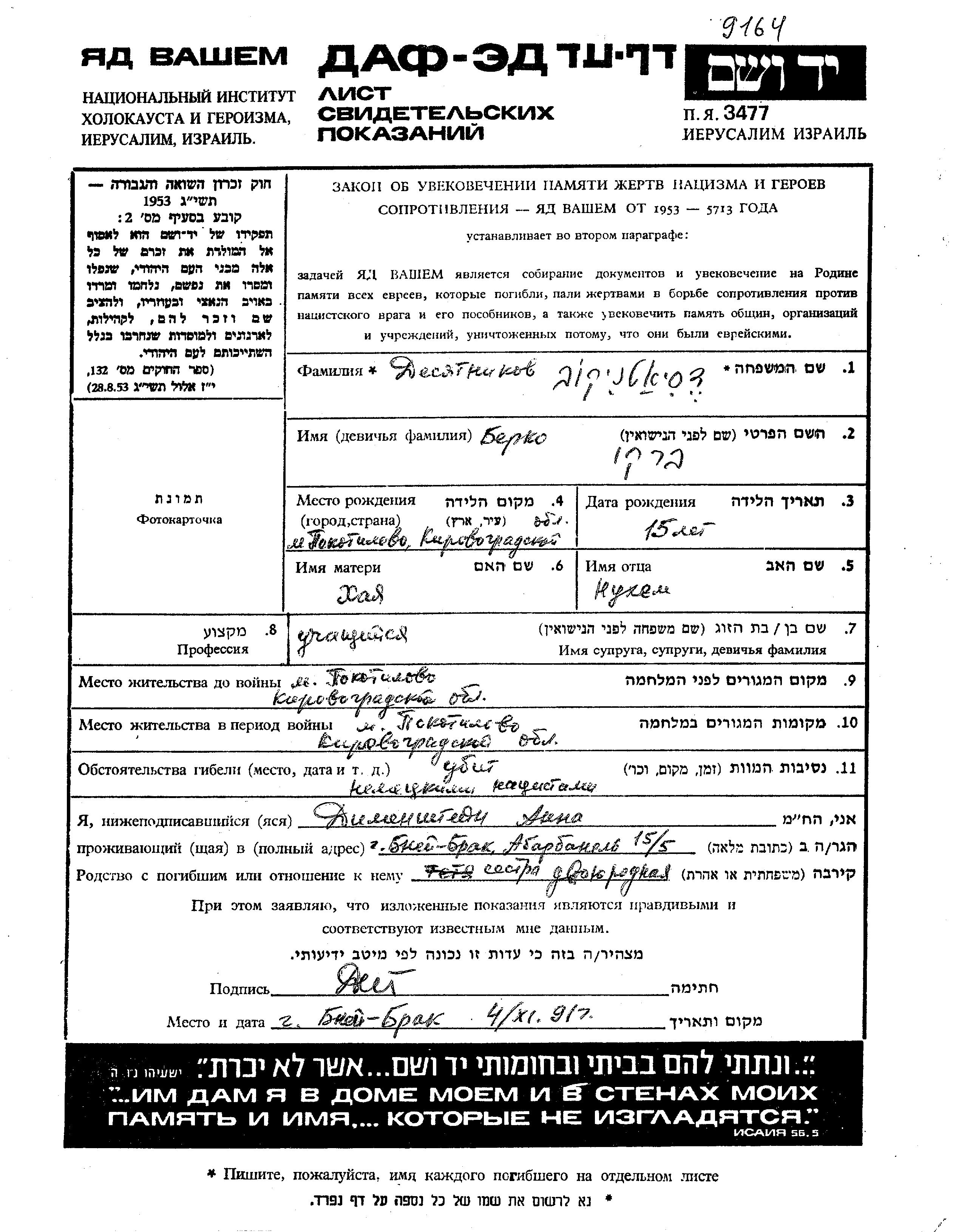 Berko Desyatnikov was born in Pokotilovo, Ukraine (USSR) to Nukhem and Khaia. He was a pupil and child. Prior to WWII he lived in Pokotilovo, Ukraine (USSR). During the war he was in Pokotilovo, Ukraine (USSR). Berko was murdered in the Shoah.