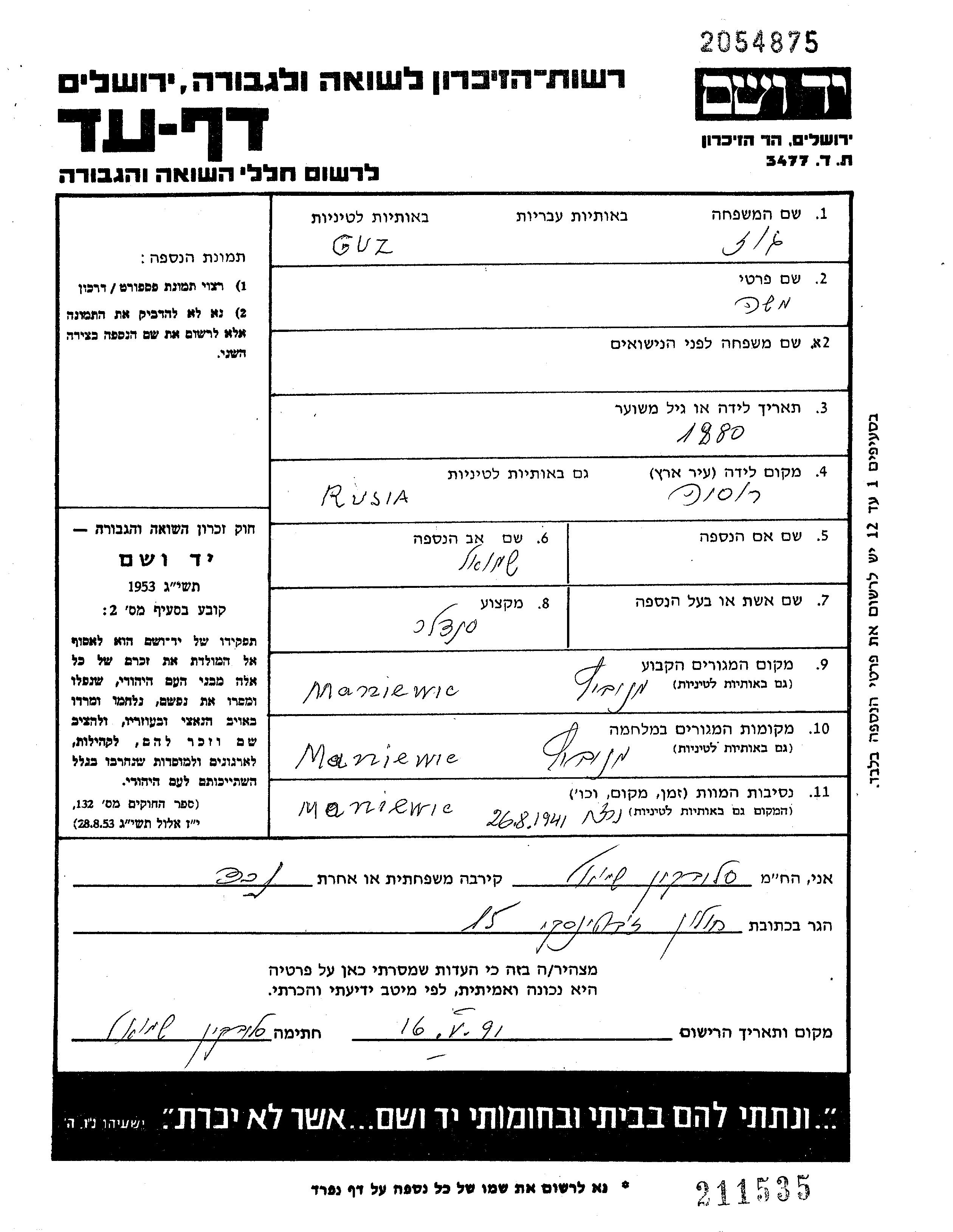 Moshe Guz was born in Russia (USSR), 1880 to Shmuel. He was a shoemaker. Prior to WWII he lived in Maniewicze, Poland. During the war he was in Maniewicze, Poland. Moshe was murdered in the Shoah. Place of death: Maniewicze, Poland, 26/08/1941.