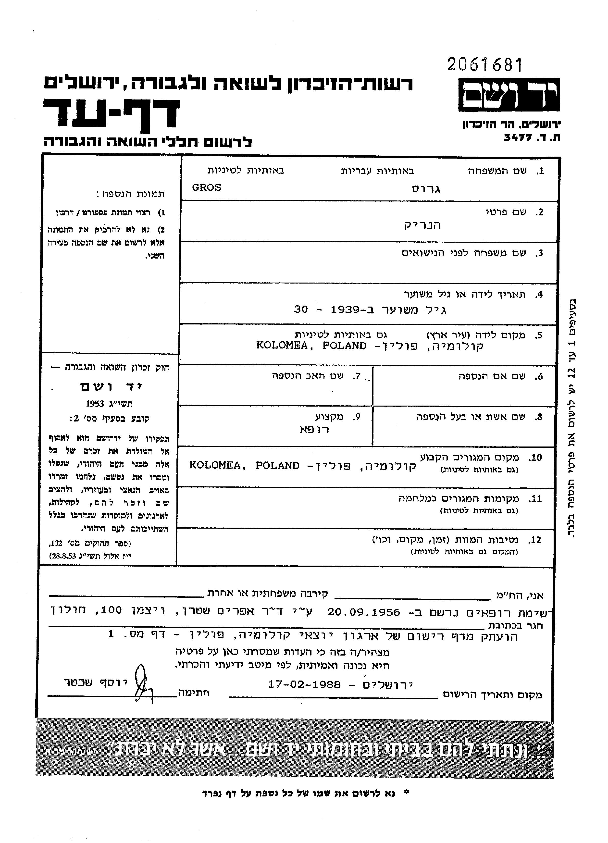 Gros Henrik 1909 Kolomyja, Poland Page of Testimony