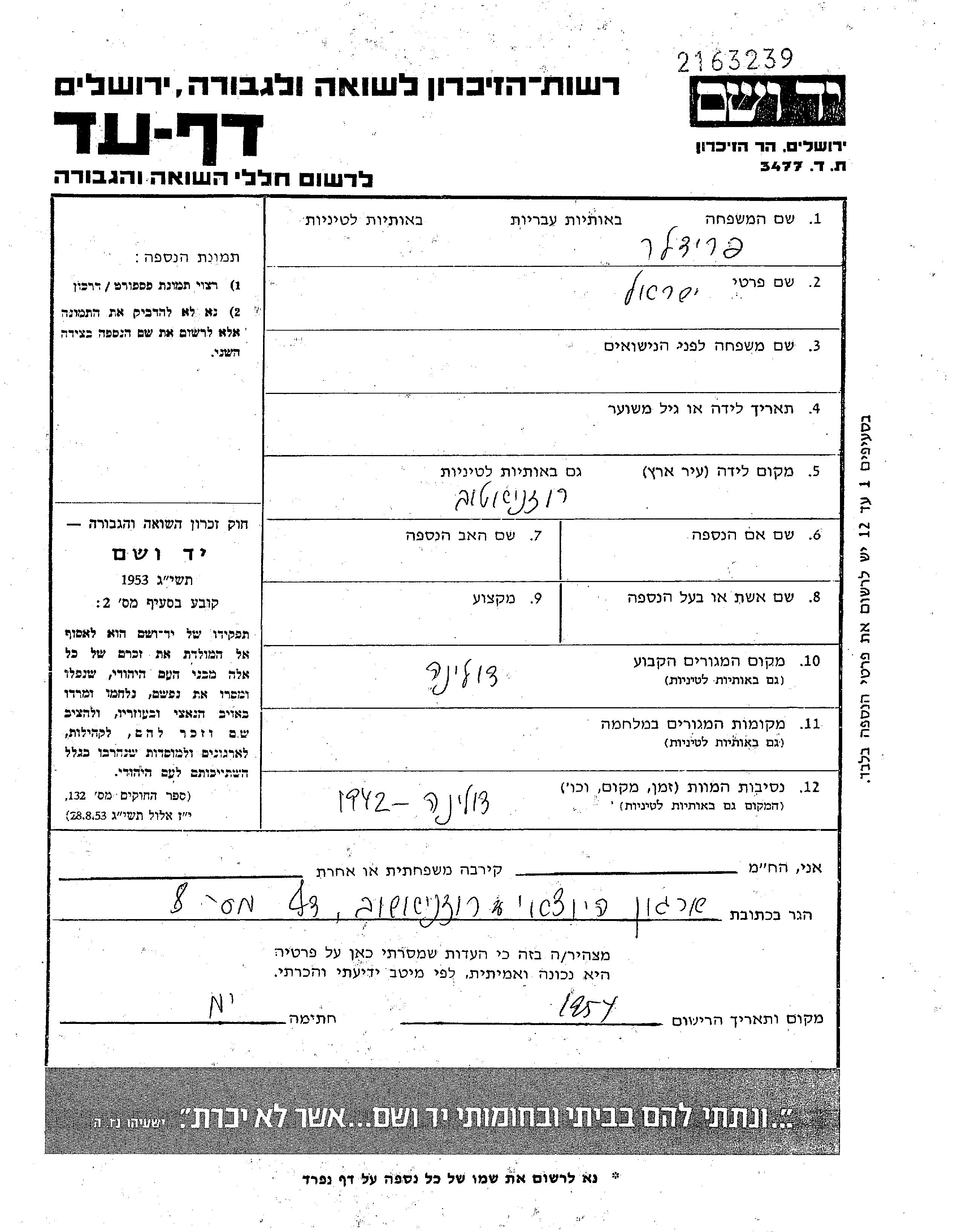 Fridler Israel Dolina, Poland Page of Testimony