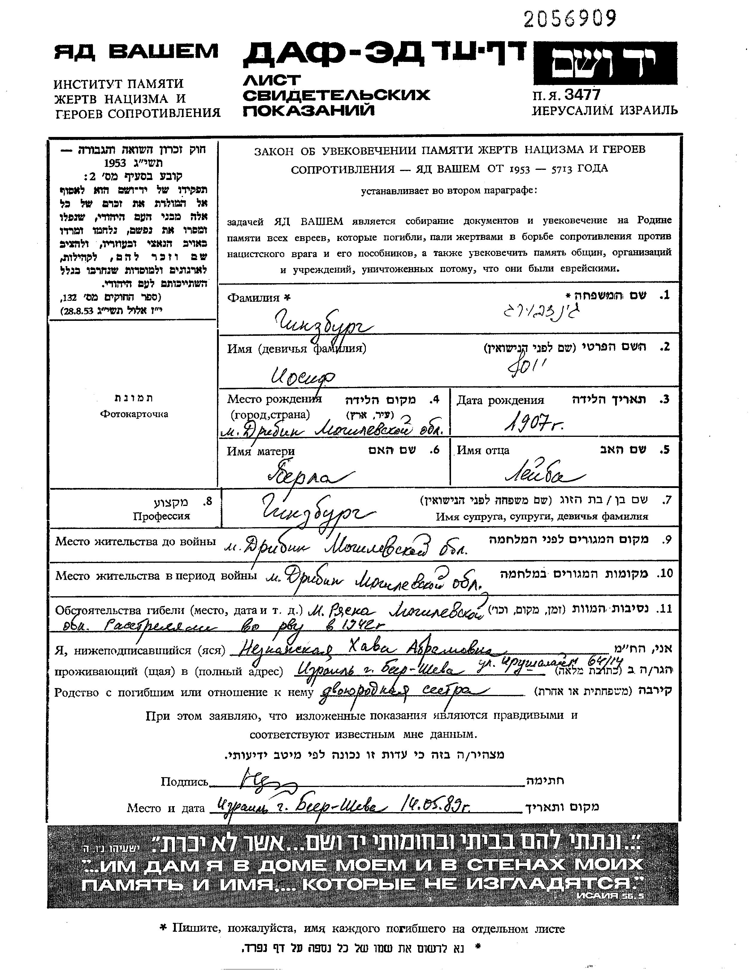 Ginzburg Iosif 1907 Dribin, Belorussia (USSR) Page of Testimony