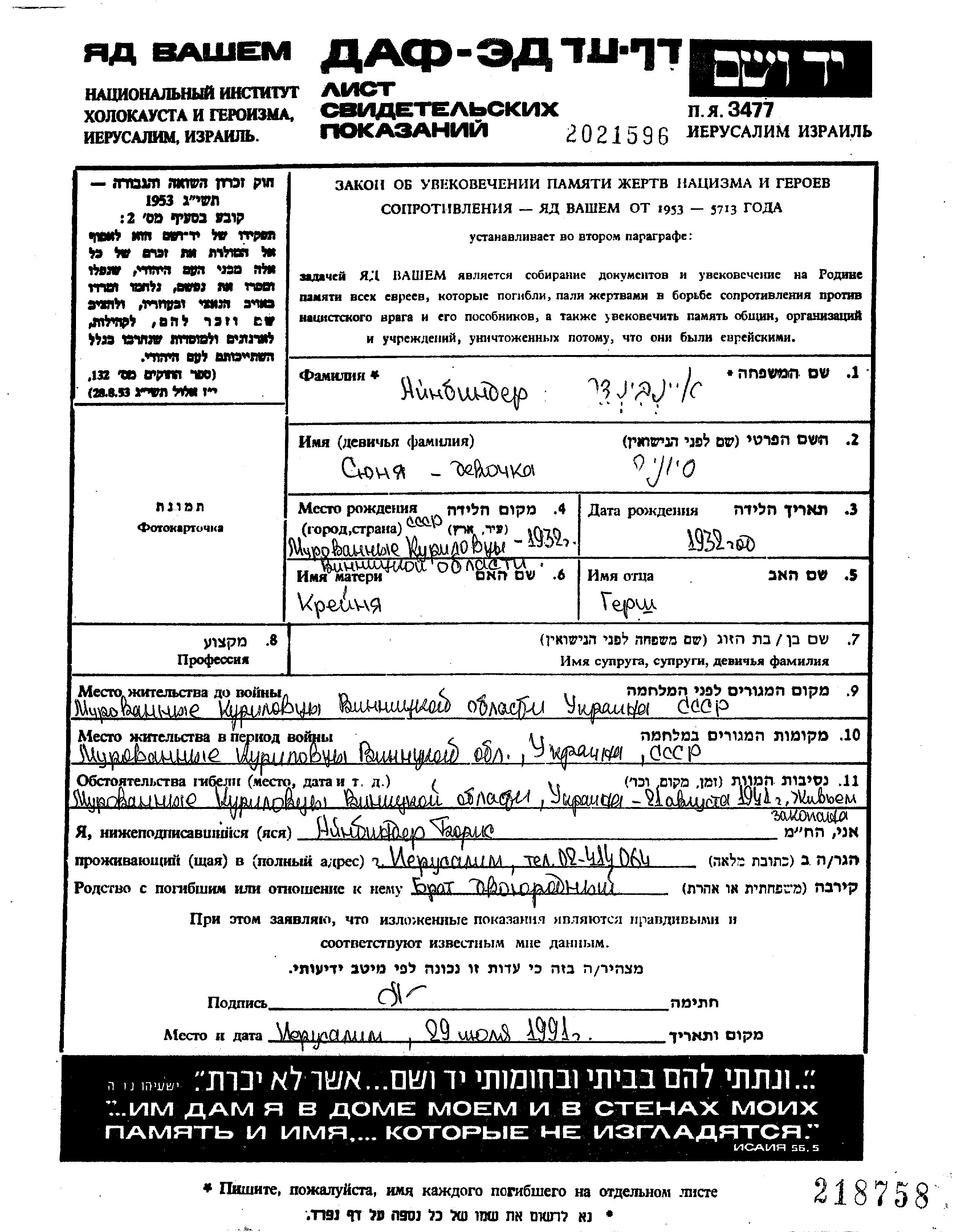 Syunya Siunia Ainbinder was born in Murovanyye Kurilovtsy, Ukraine (USSR), 1932 to Gersh and Kreynya. He was child. Prior to WWII he lived in Murovanyye Kurilovtsy, Ukraine (USSR). During the war he was in Murovanyye Kurilovtsy, Ukraine (USSR). Syunya Siunia was murdered in the Shoah. Place of death: Murovanyye Kurilovtsy, Ukraine (USSR), 21/08/1941.