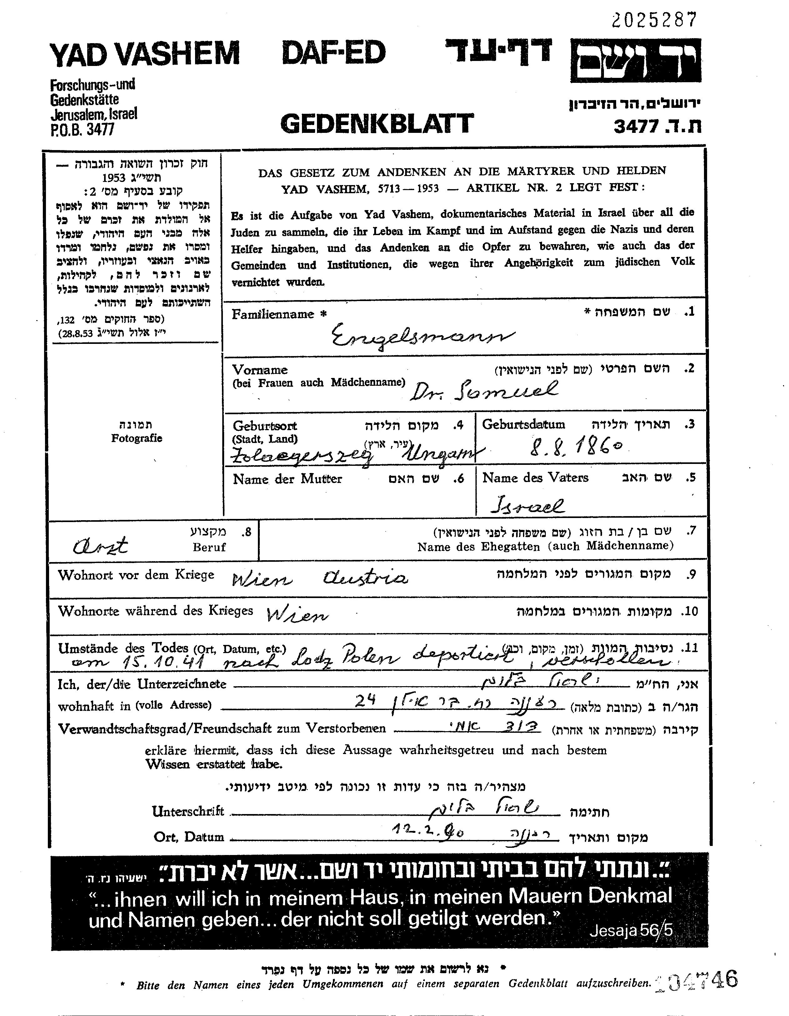 Zamuel Engelsmann was born in Zalaegerszeg, Hungary, 1860 to Israel. He was a physician. Prior to WWII he lived in Wien, Austria. During the war he was in Wien, Austria. Zamuel was murdered in the Shoah.