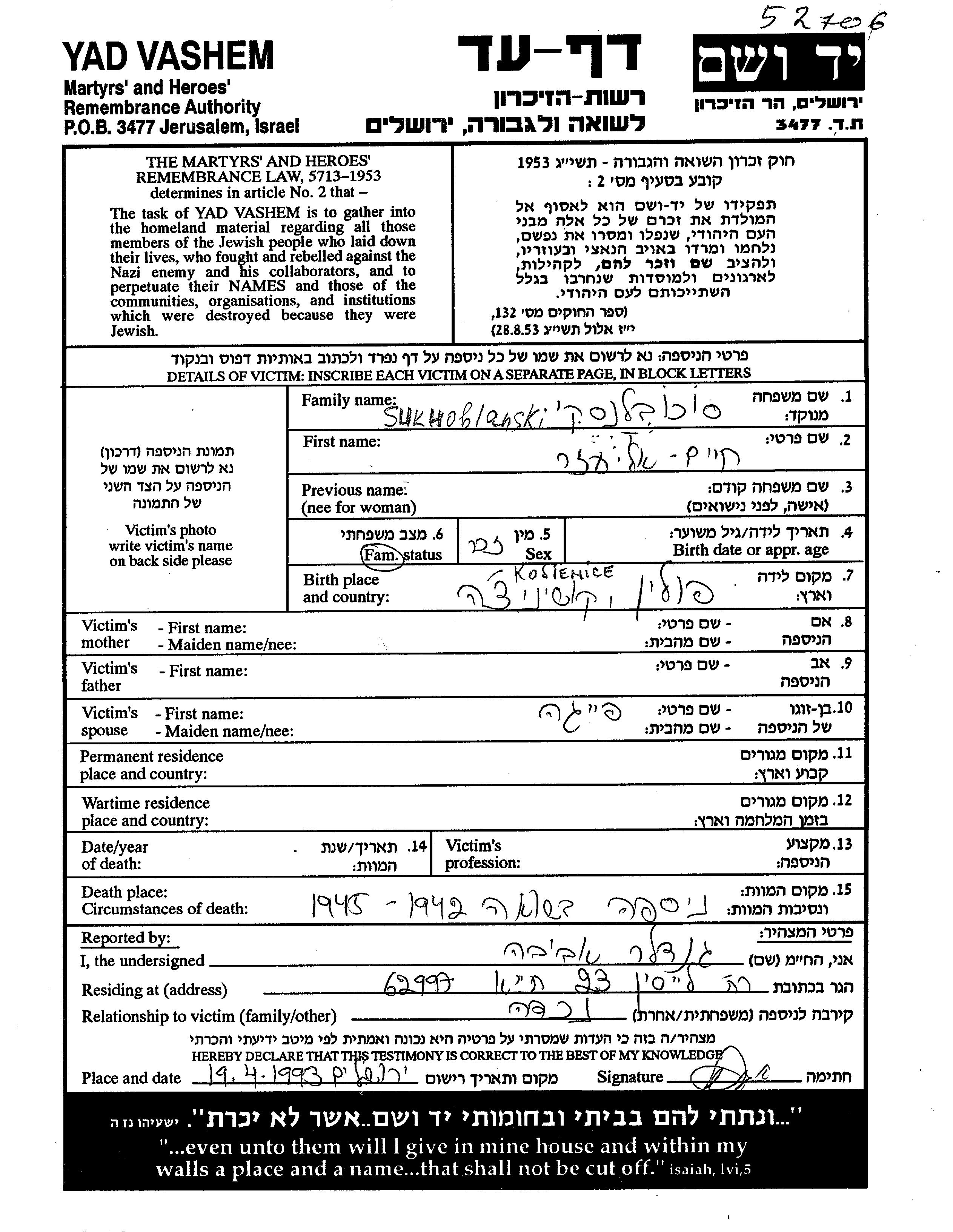 Sukhoblanski Khaim Eliezer unstated place, Page of Testimony