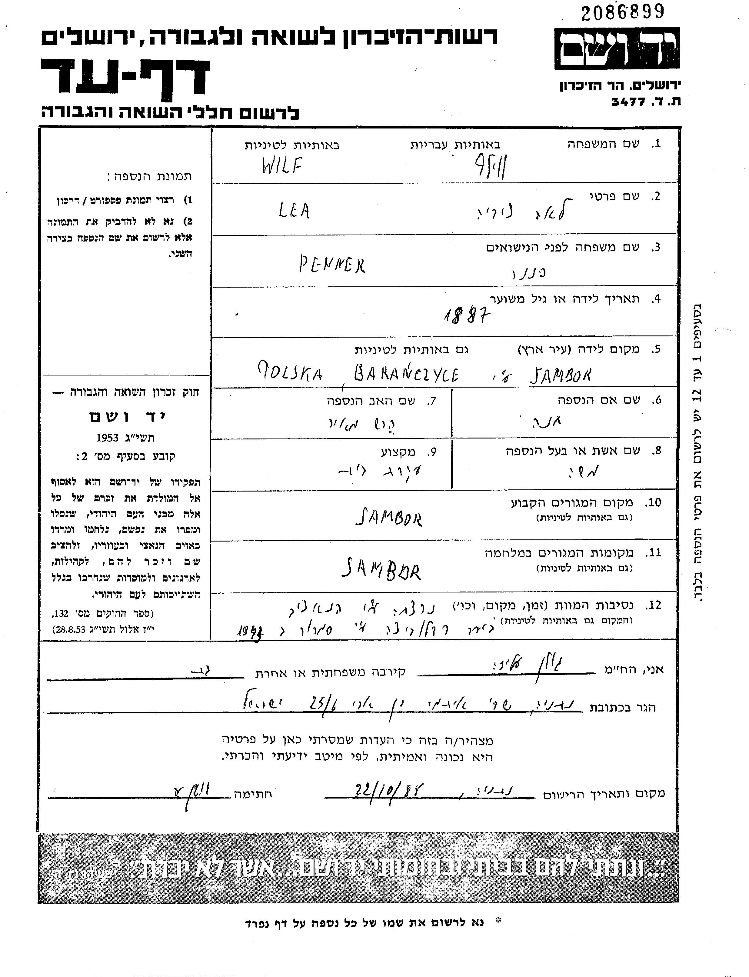 Tzvia Lea Wilf nee Penner was born in Bakonczyce, Poland, 1887 to Hersh Meir and Khana. She was a housewife and married to Moshe. Prior to WWII she lived in Sambor, Poland. During the war she was in Sambor, Poland. Tzvia Lea was murdered in the Shoah. Place of death: Radlowice, Poland, 1943.