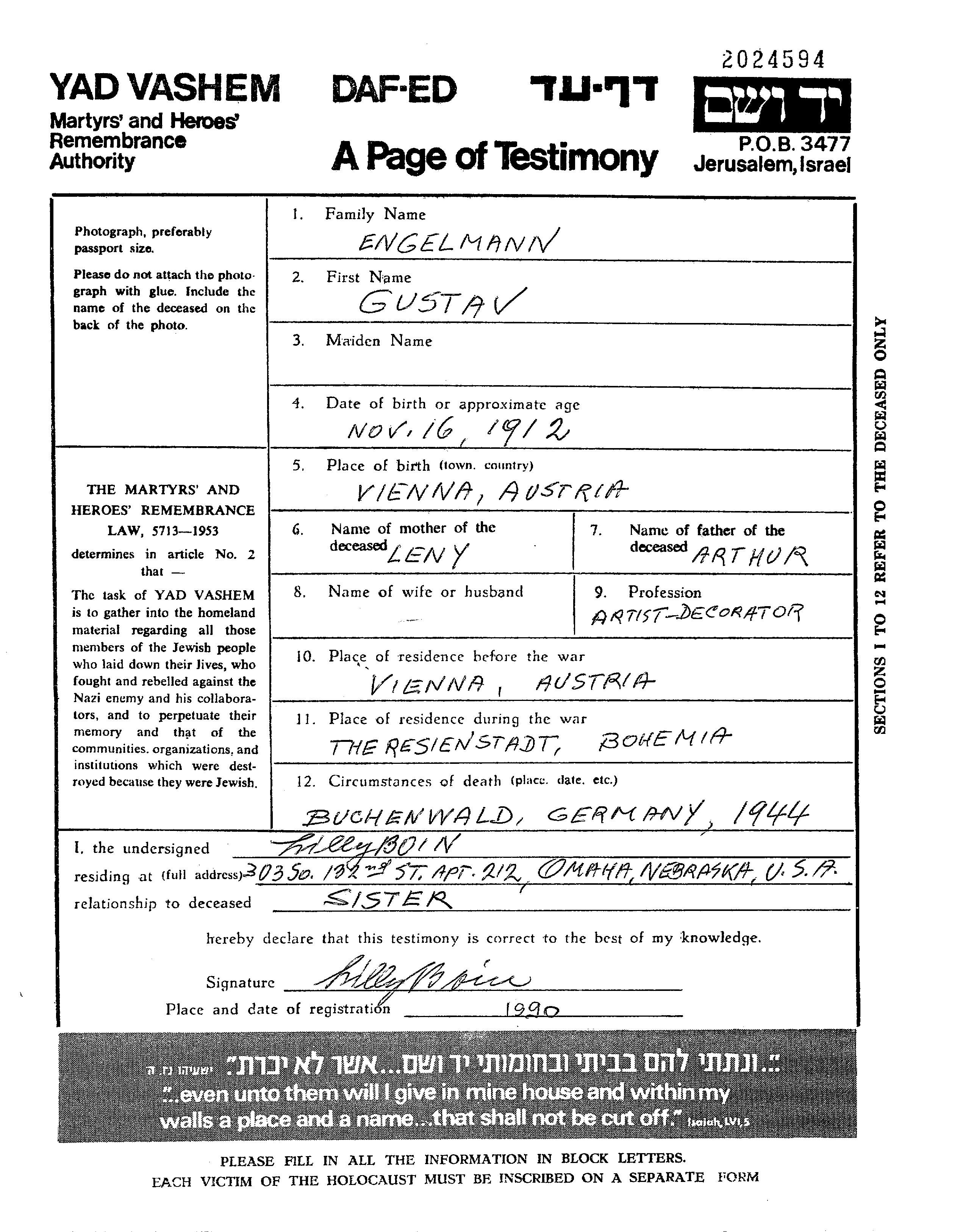 Gustav Engelmann was born in Wien, Austria, 1912 to Arthur and Leny nee Rothenberg. He was a painter (artist). Prior to WWII he lived in Wien, Austria. During the war he was in Theresienstadt, Czechoslovakia. Gustav was murdered in the Shoah. Place of death: Buchenwald, Germany, 1944.