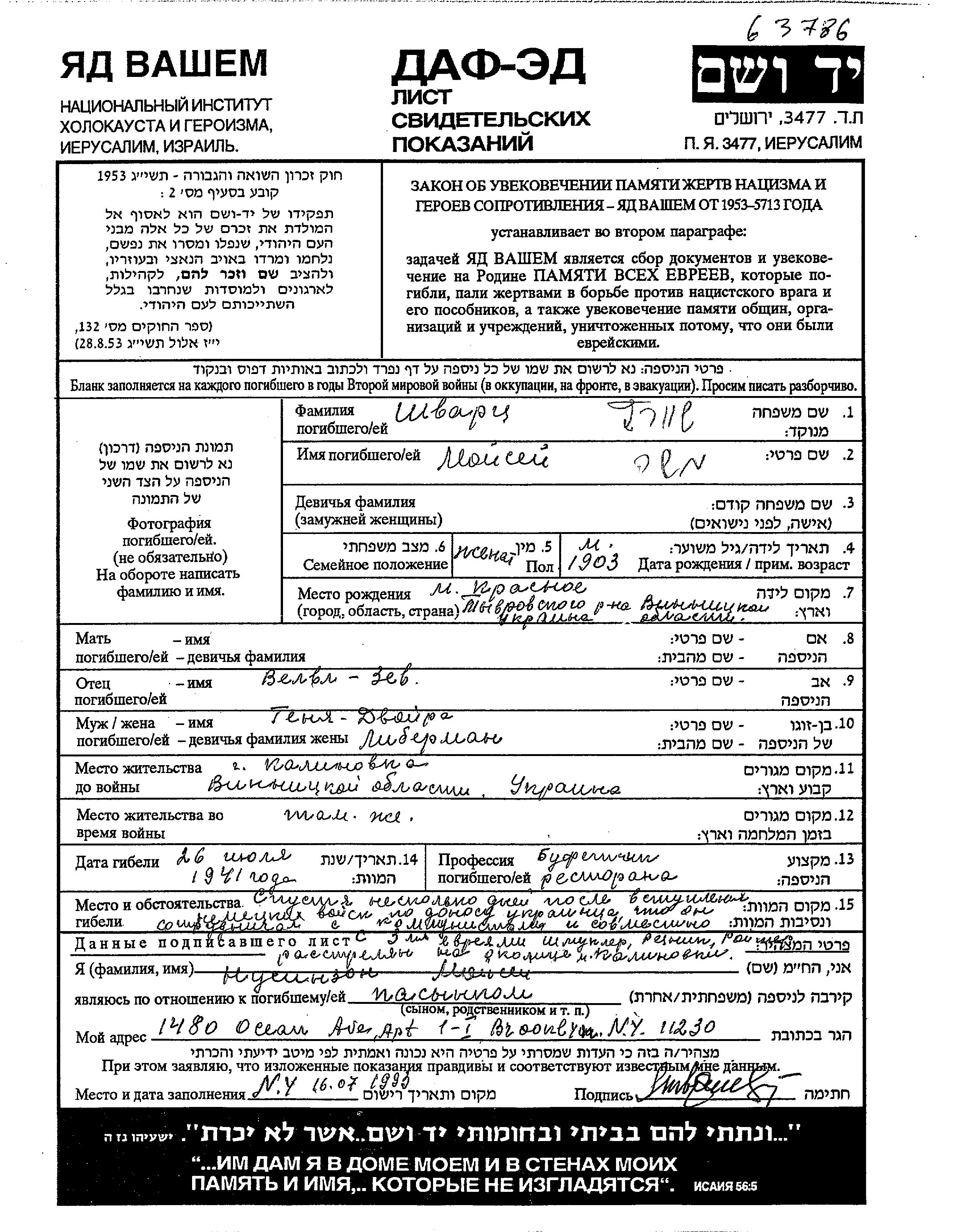 Shvartz Moisei 1903 Kalinovka, Ukraine (USSR) Page of Testimony