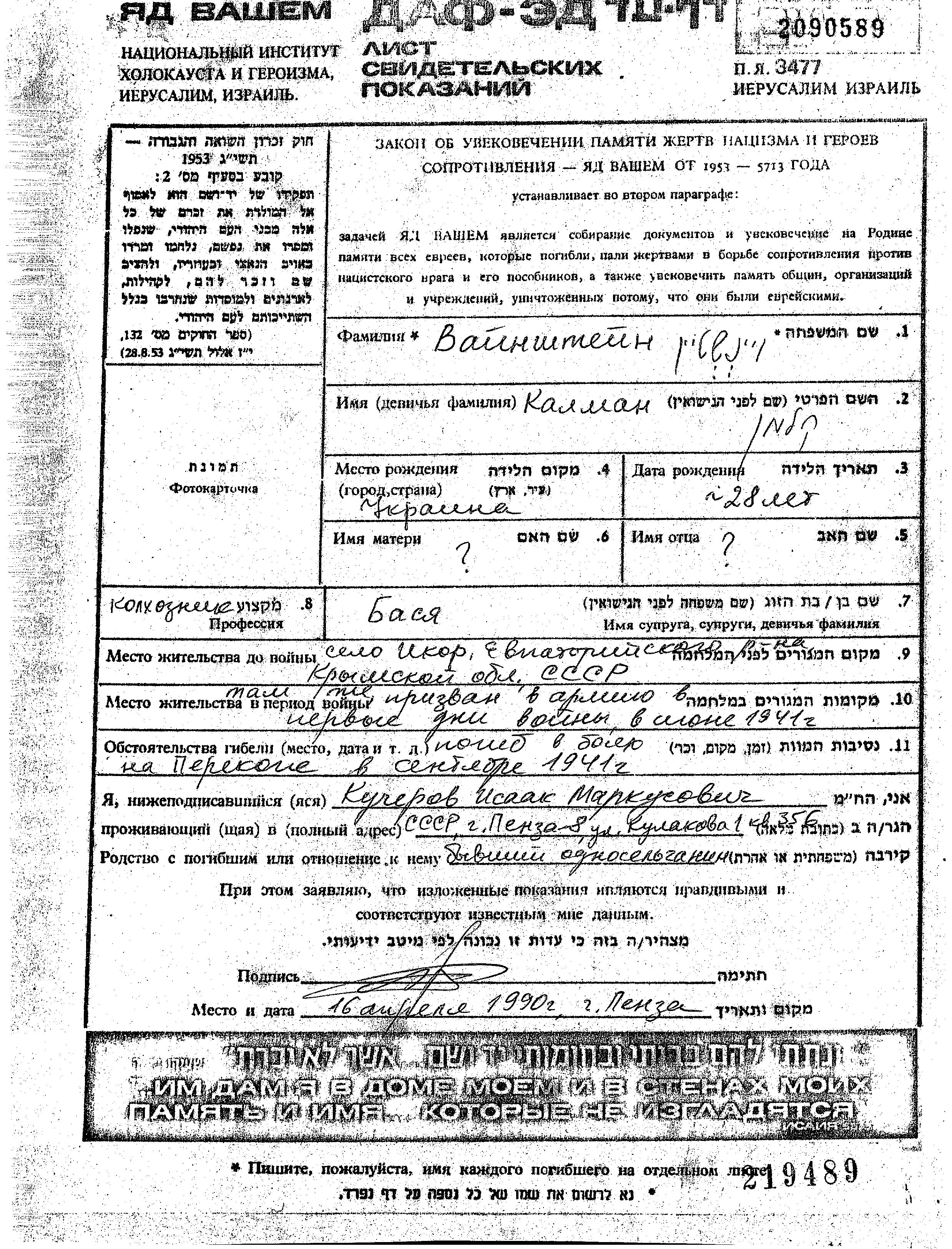 Kalman Vainshtein was born in Ukraine (USSR), 1913. He was an agriculturist and married to Basya. Prior to WWII he lived in Ikor, Russia (USSR). During the war he was in the Soviet armed forces. Kalman was killed in military service in WWII. Place of death: Perekop, Russia (USSR), 1941.