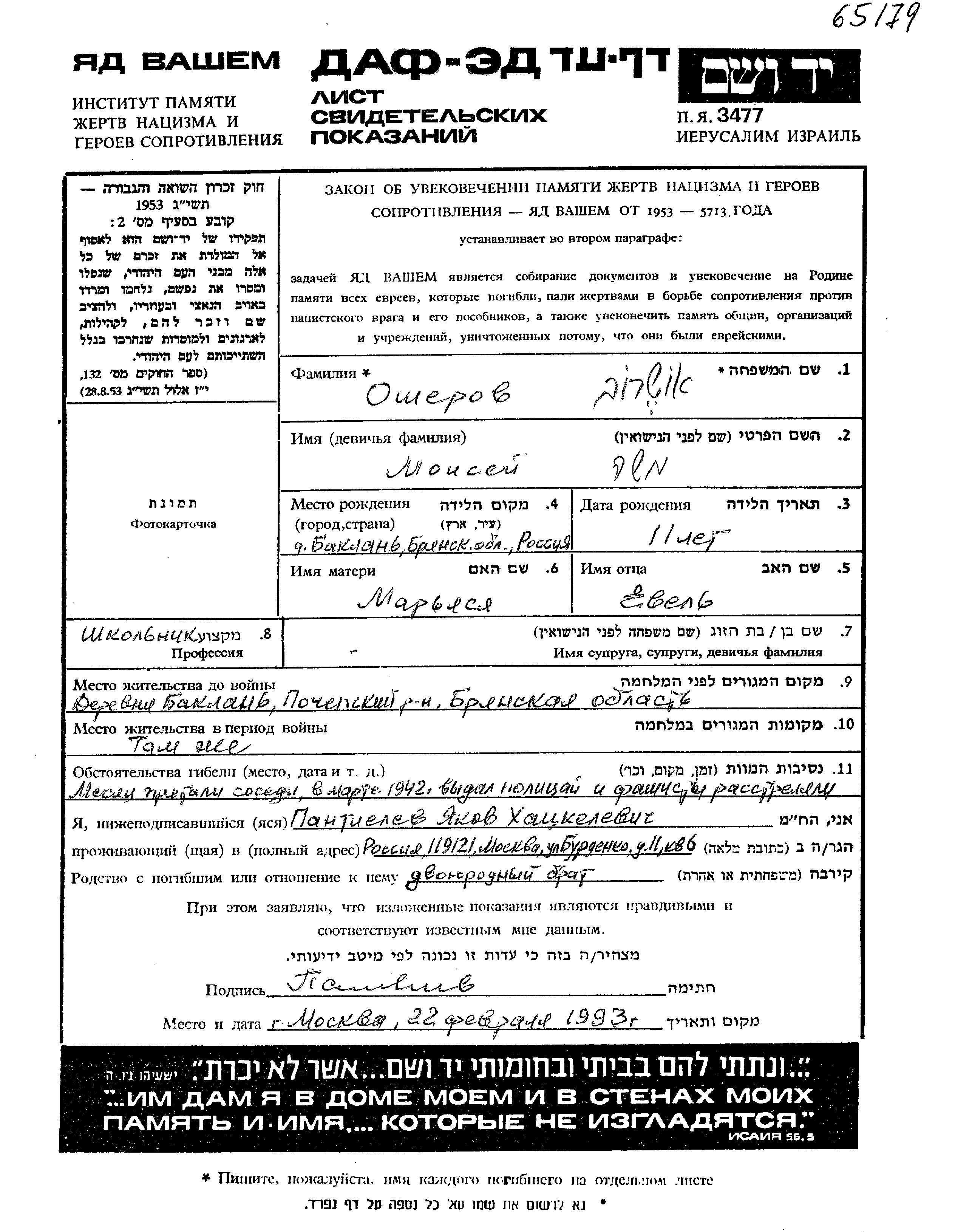 Osherov Moisei 1931 Baklan, Russia (USSR) Page of Testimony