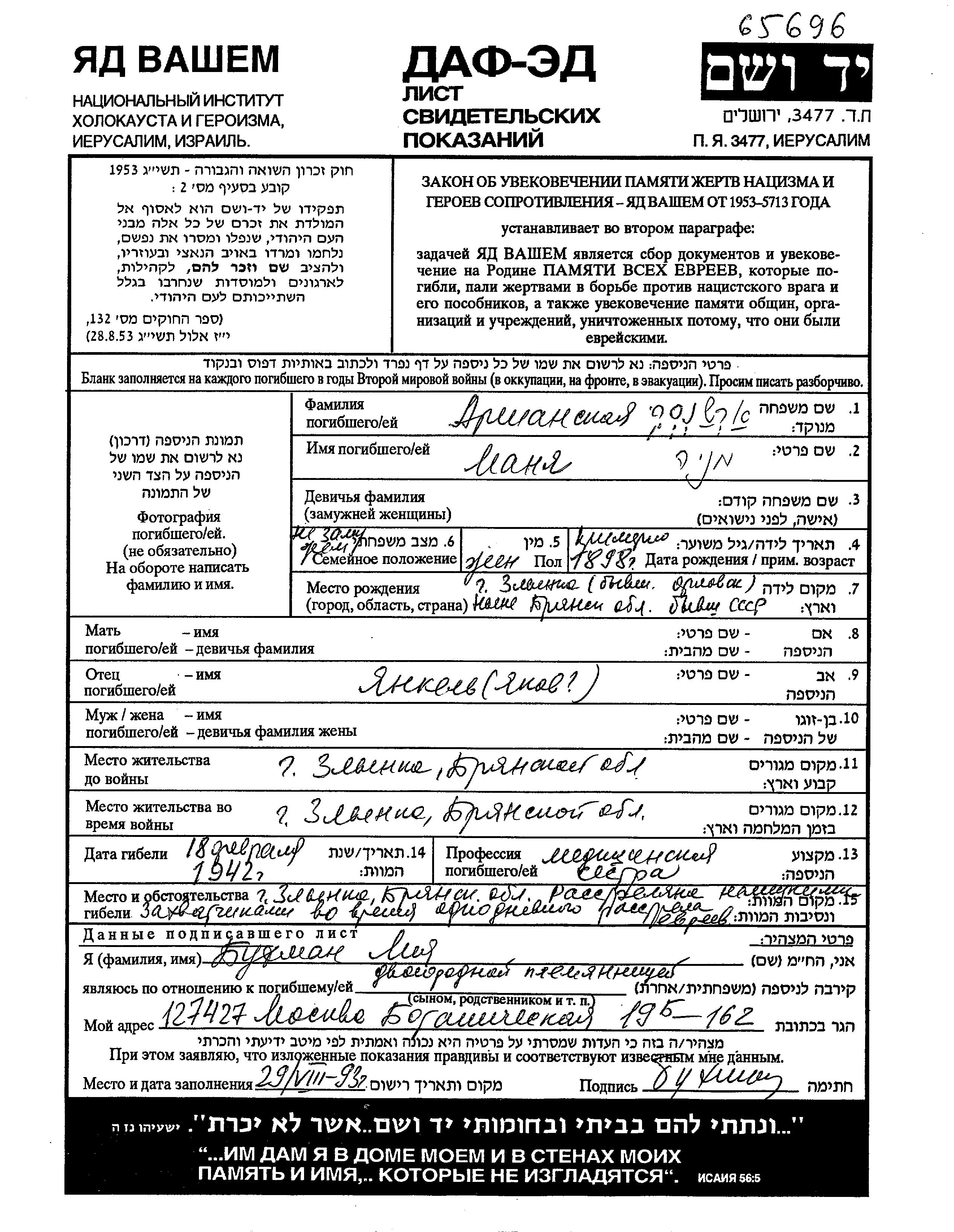 Arshanski Mania 1898 Zlynka, Russia (USSR) Page of Testimony