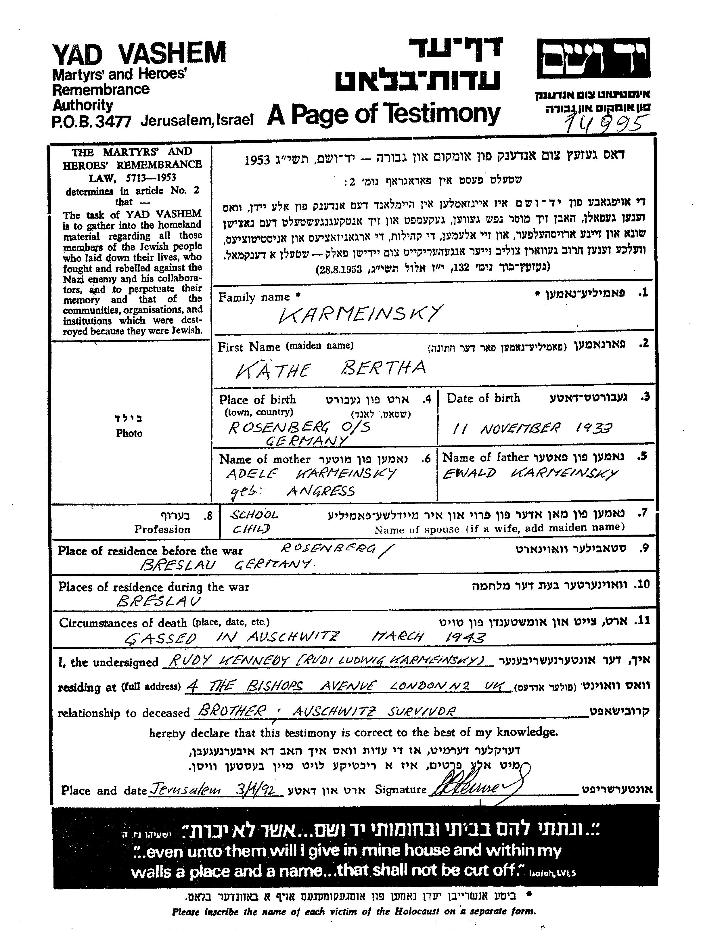 Kathe Bertha Karmeinsky was born in Rosenberg Oberschlesien, Germany, 1933 to Ewald and Adele Edel nee Angress. She was a pupil and child. Prior to WWII she lived in Breslau, Germany. During the war she was in Breslau, Germany. Kathe Bertha was murdered in the Shoah. Place of death: Auschwitz, Poland, 1943.