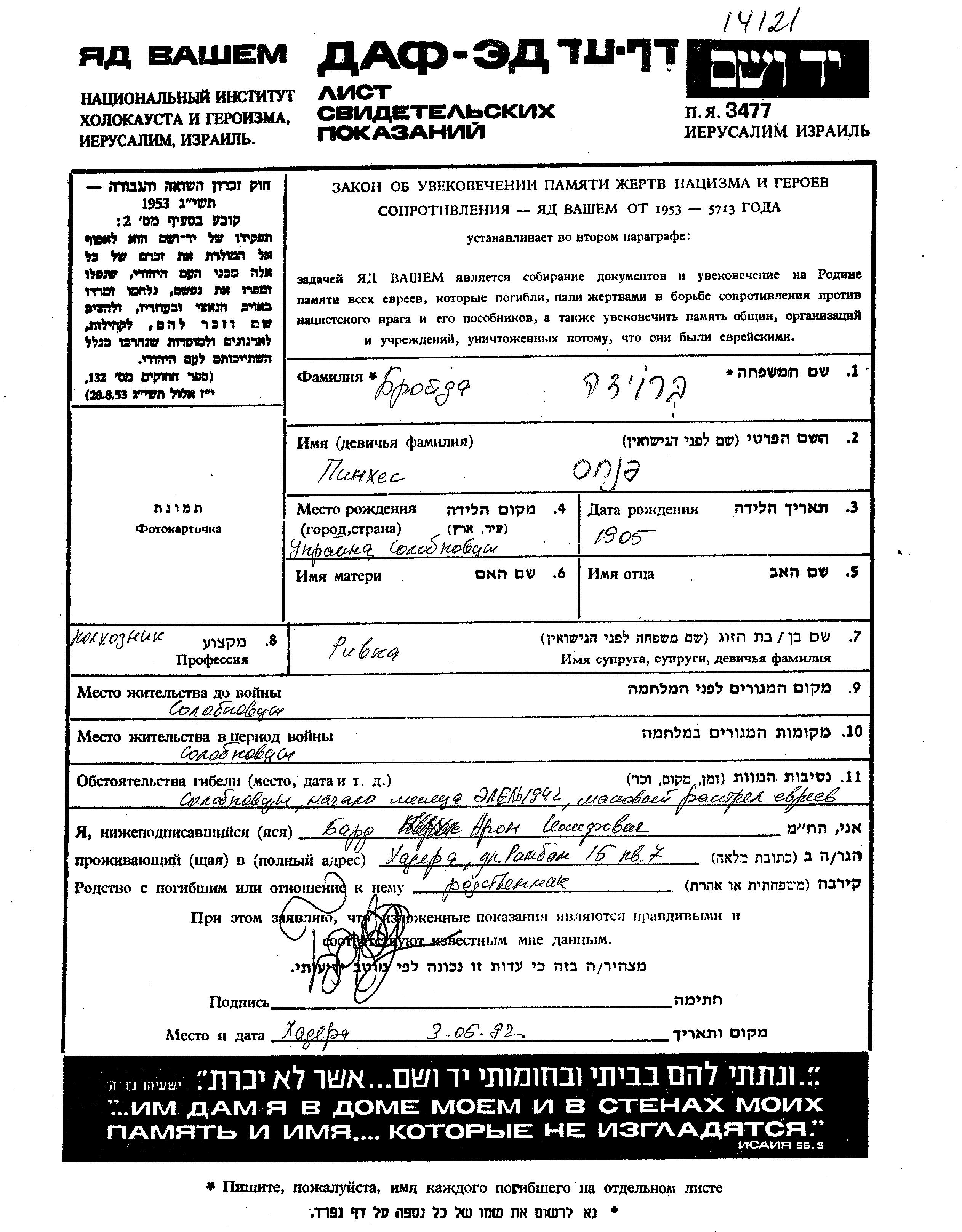 Broida Pinkhes 1905 Solobkovtsy, Ukraine (USSR) Page of Testimony