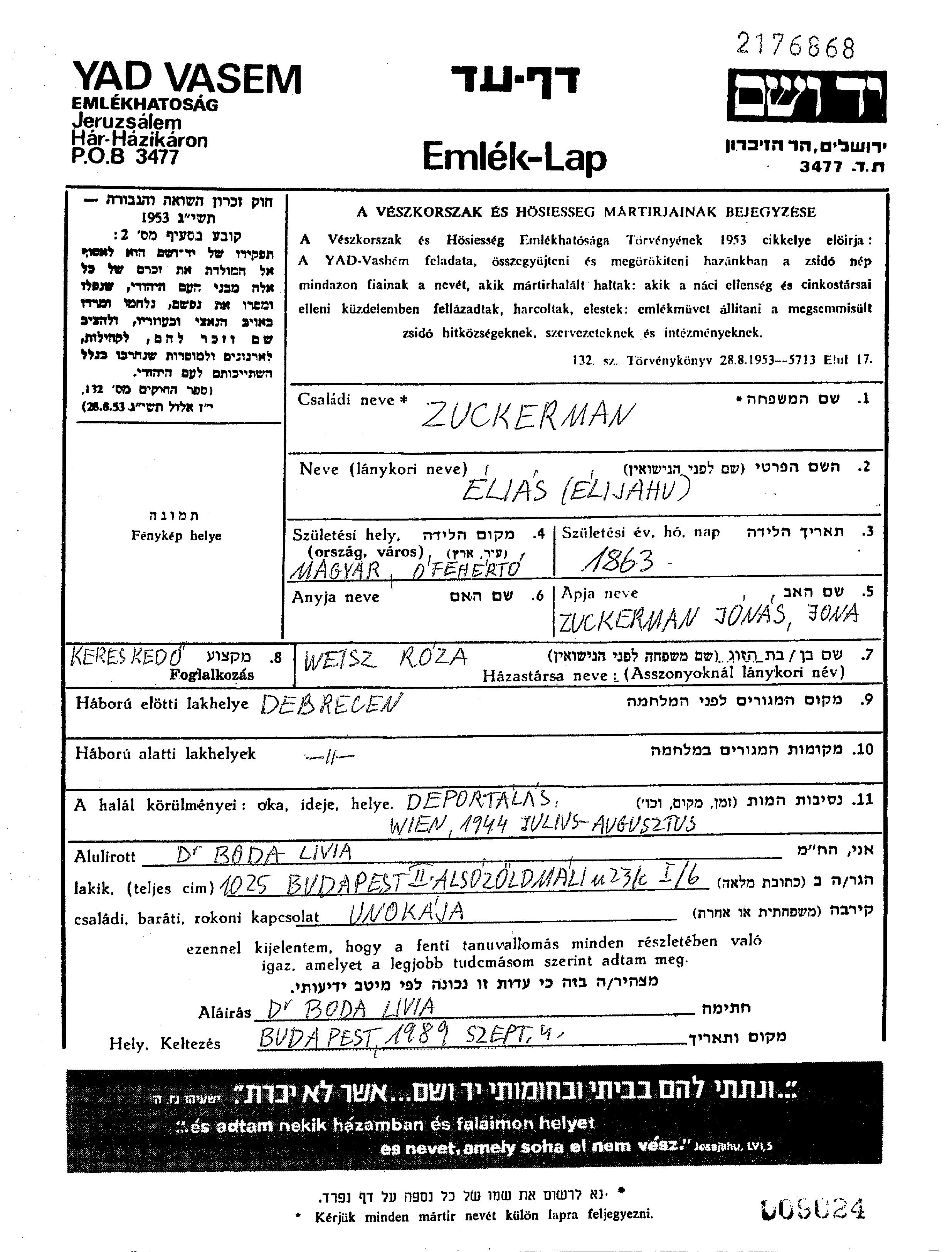 Zuckerman Elias 1863 Debrecen, Hungary Page of Testimony