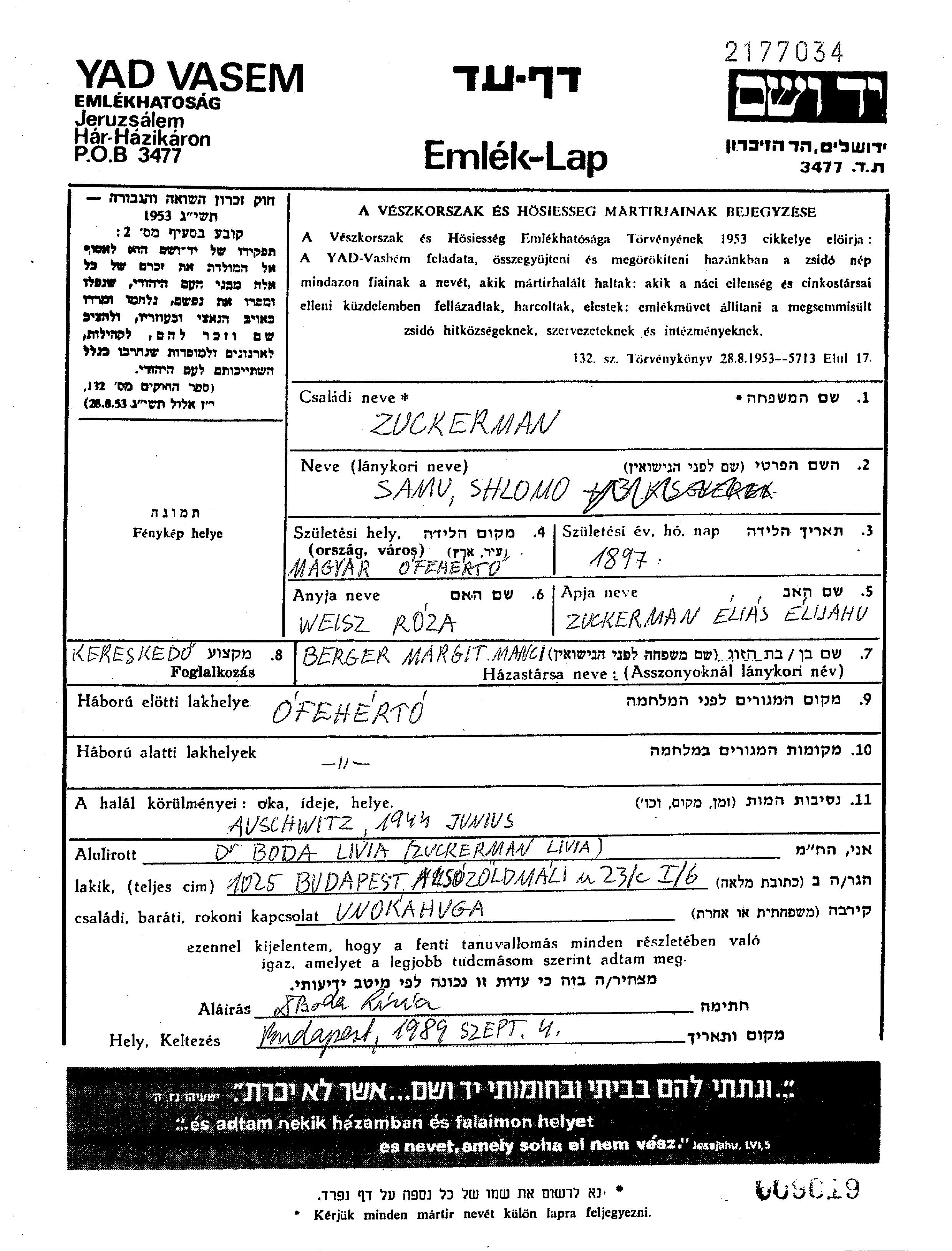 Zuckerman Samu Shmuel Shlomo 1897 Ofeherto, Hungary Page of Testimony