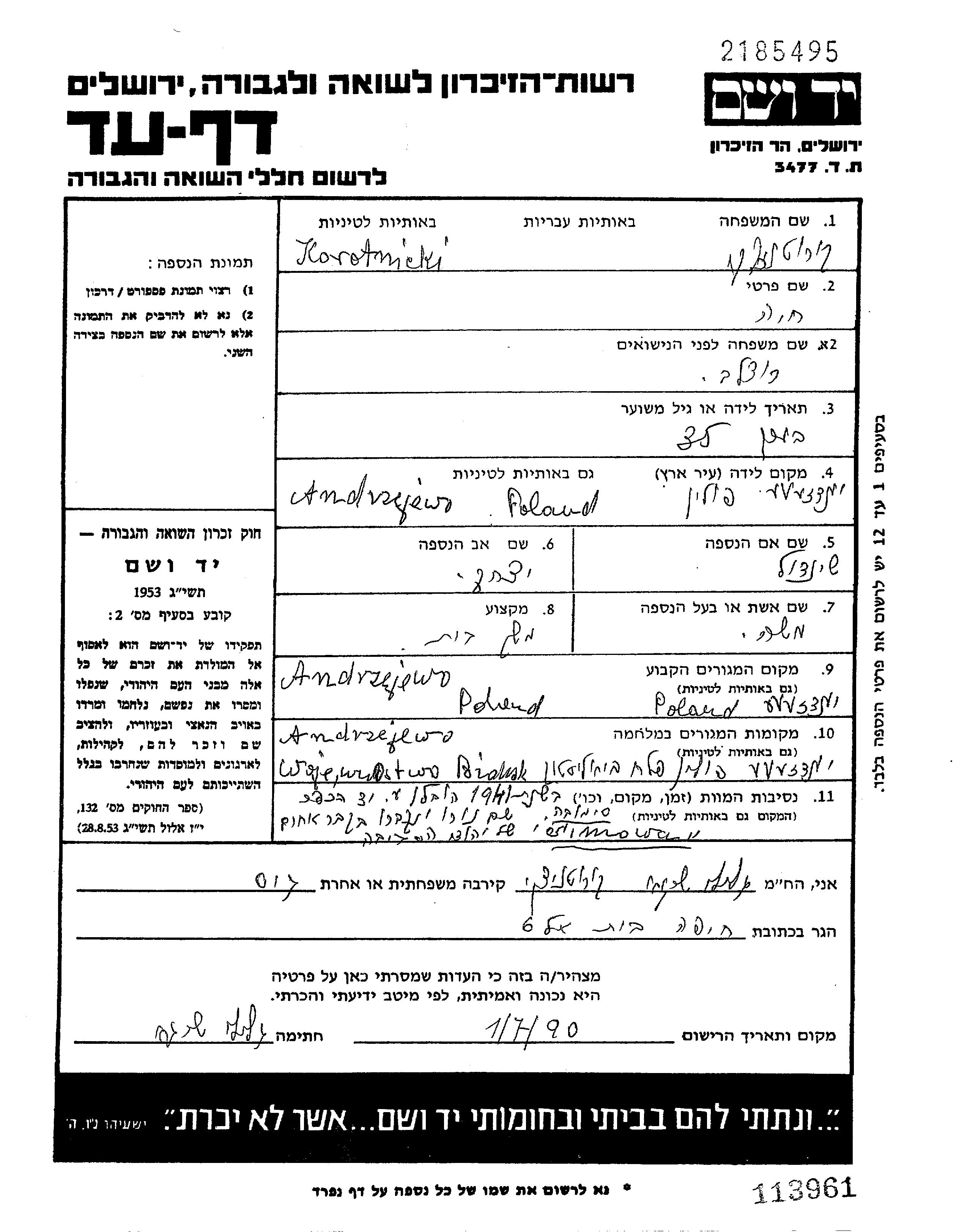 Khaia Korotnicki nee Rudlov was born in Andrzejewo, Poland, 1906 to Ytzkhak and Sheindl. She was a land owner and married to Mosze. Prior to WWII she lived in Andrzejewo, Poland. During the war she was in Andrzejewo, Poland. Khaia was murdered in the Shoah. Place of death: Szumowo, Poland, 1941.