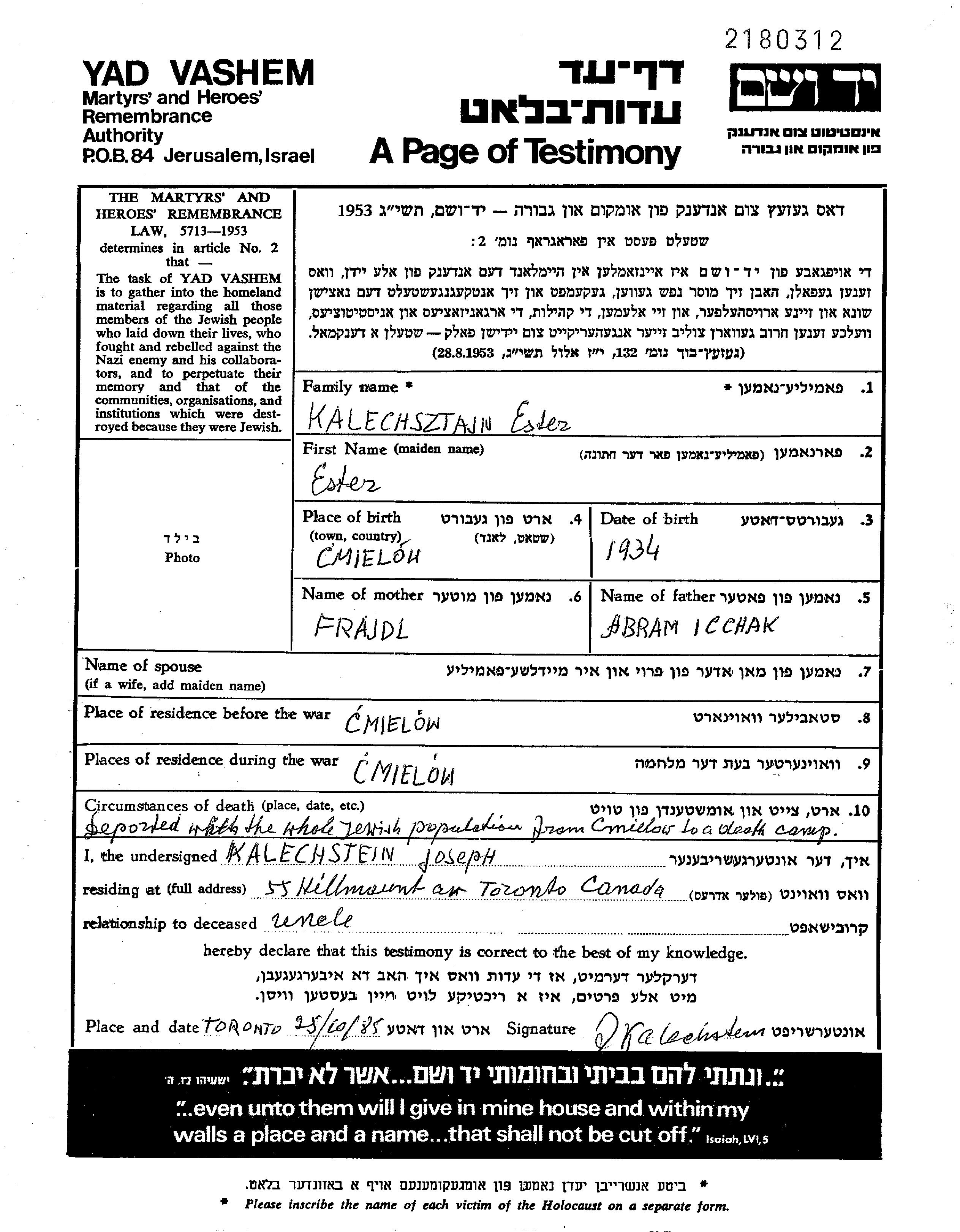 Kalechsztajn Ester 1934 Cmielow, Poland Page of Testimony