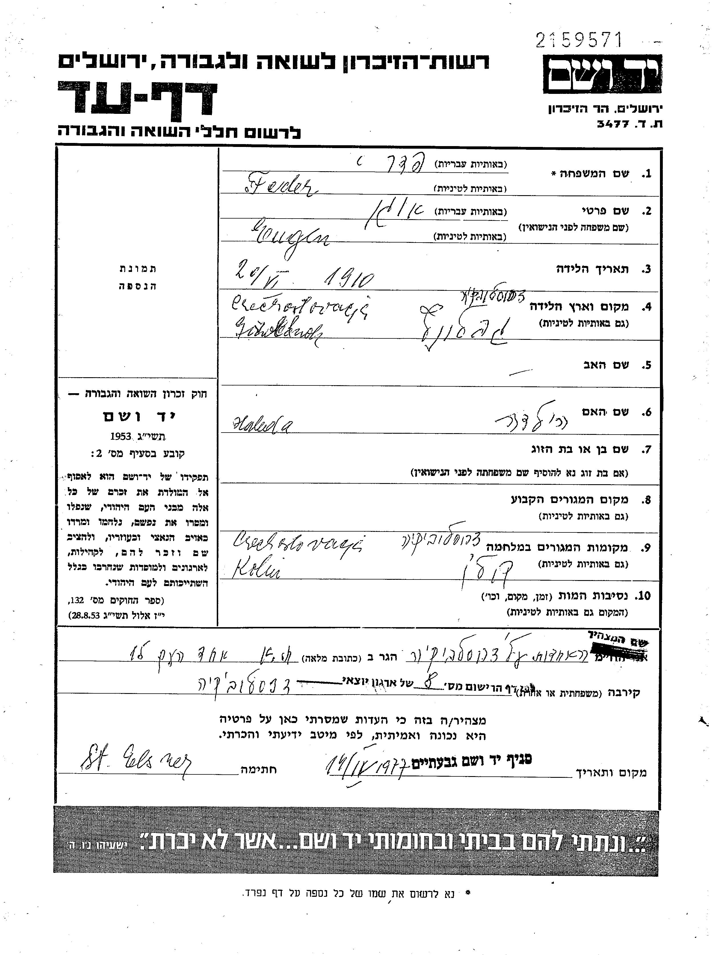 Feder Eugen 1910 Czechoslovakia Page of Testimony