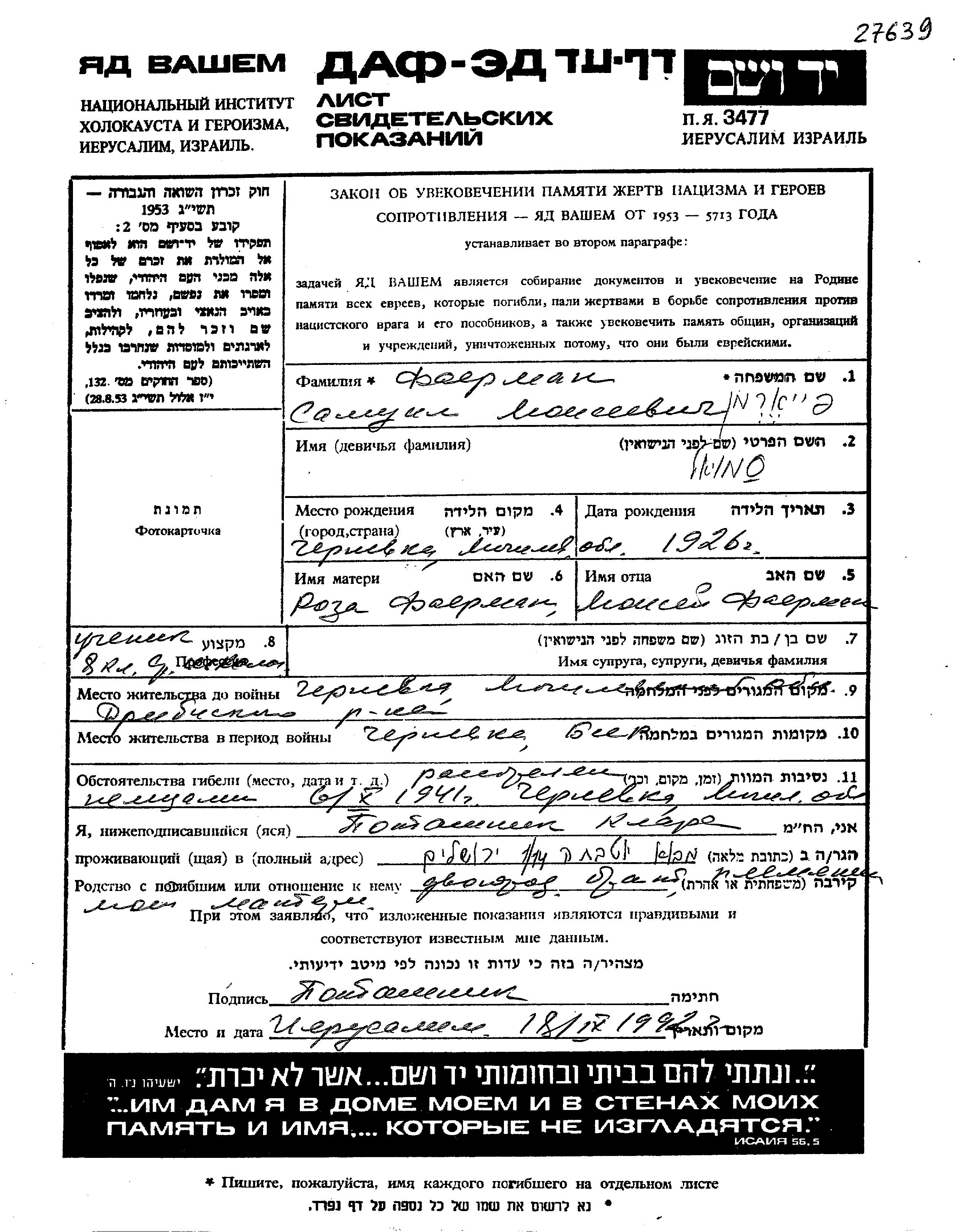 Samuil Fayerman was born in Chernevka, Belorussia (USSR), 1926 to Moisei and Roza. He was a pupil and child. Prior to WWII he lived in Chernevka, Belorussia (USSR). During the war he was in Chernevka, Belorussia (USSR). Samuil was murdered in the Shoah. Place of death: Chernevka, Belorussia (USSR), 06/10/1941.