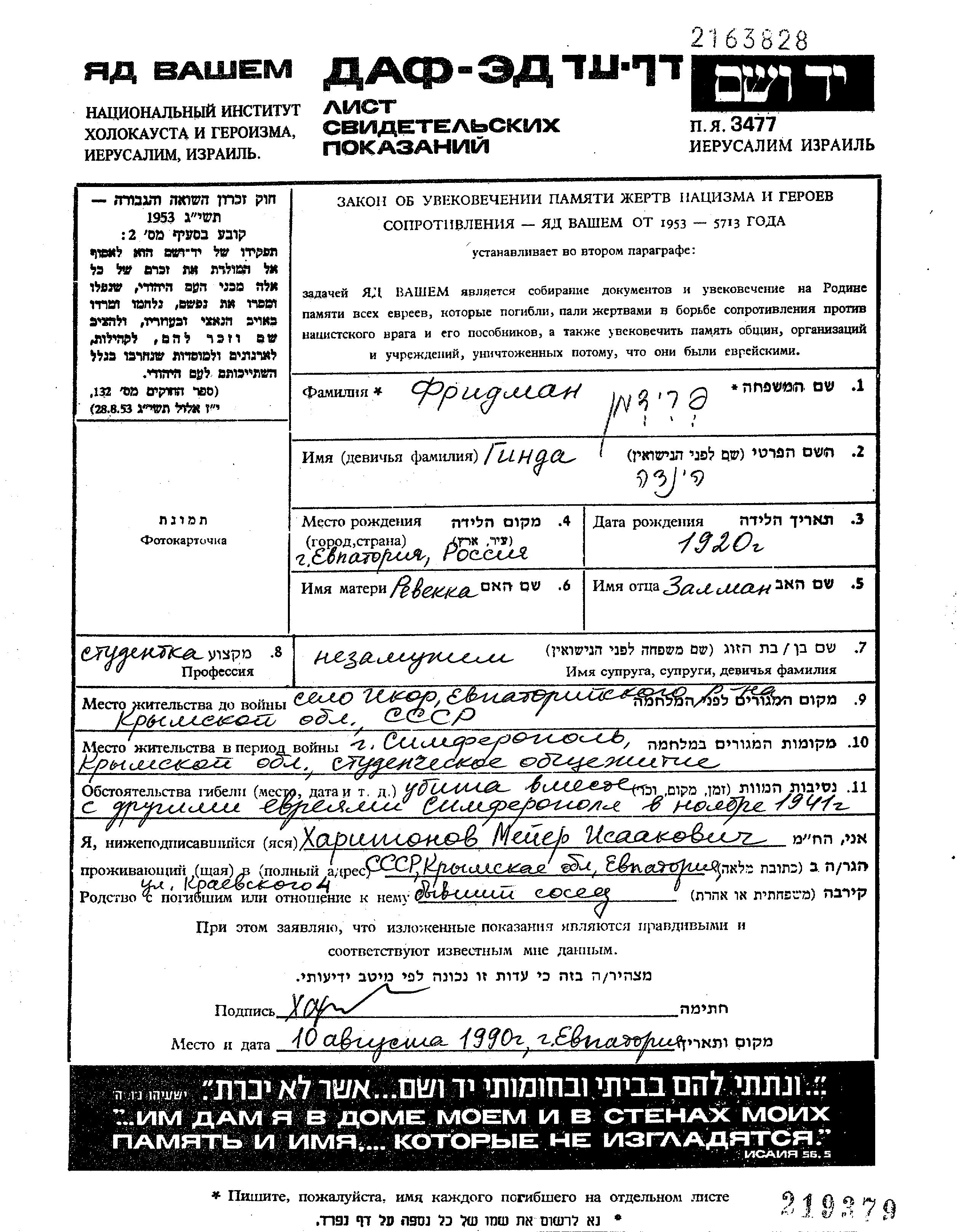 Ginda Fridman was born in Yevpatoriya, Russia (USSR), 1920 to Zalman and Reveka. She was a student and single. Prior to WWII she lived in Ikor, Russia (USSR). During the war she was in Simferopol, Russia (USSR).