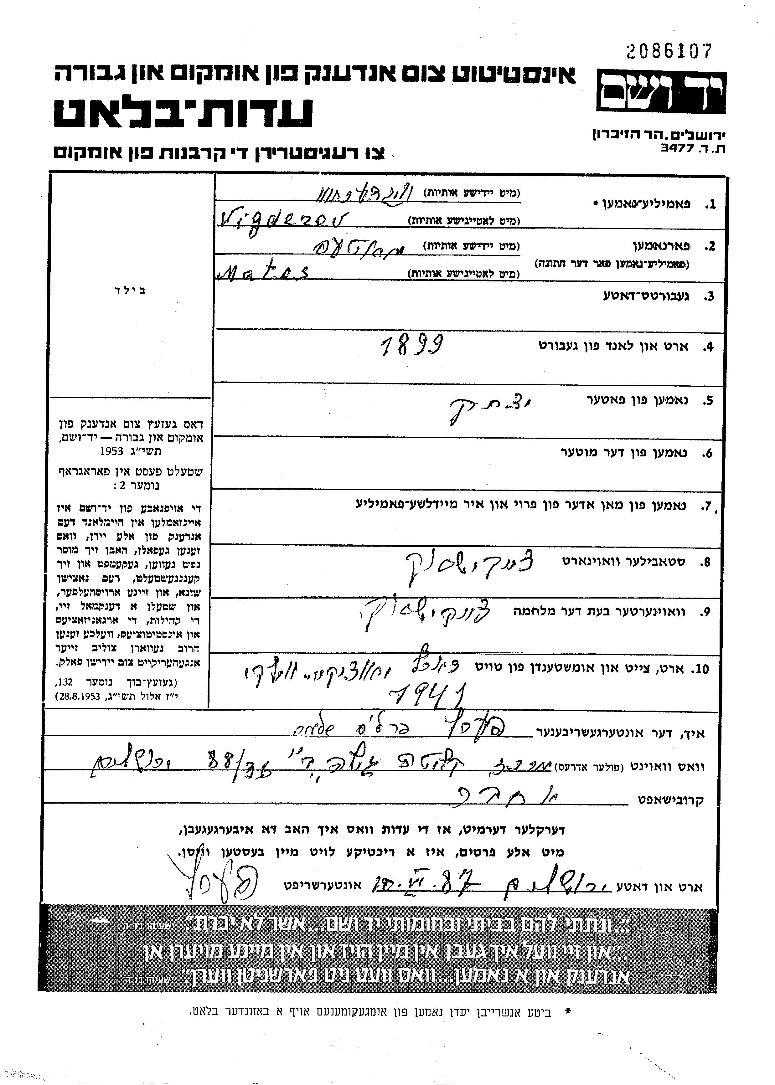 Vigderov Mates 1899 Chaikishok, Lithuania Page of Testimony