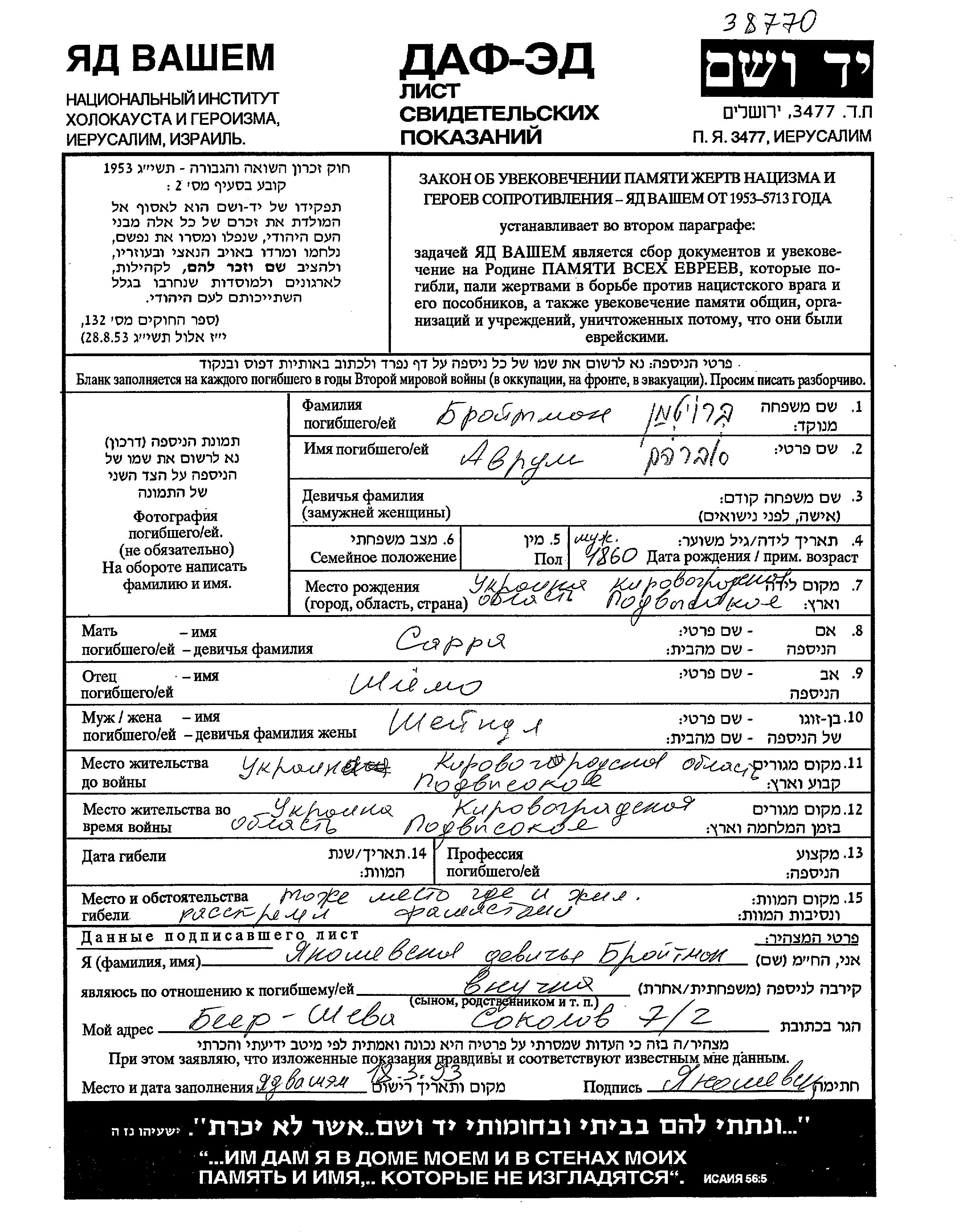 Avrum Broitman was born in Podvysokoye, Ukraine (USSR), 1860 to Shlioma and Sara. Prior to WWII he lived in Podvysokoye, Ukraine (USSR). During the war he was in Podvysokoye, Ukraine (USSR). Avrum was murdered in the Shoah. Place of death: Podvysokoye, Ukraine (USSR).