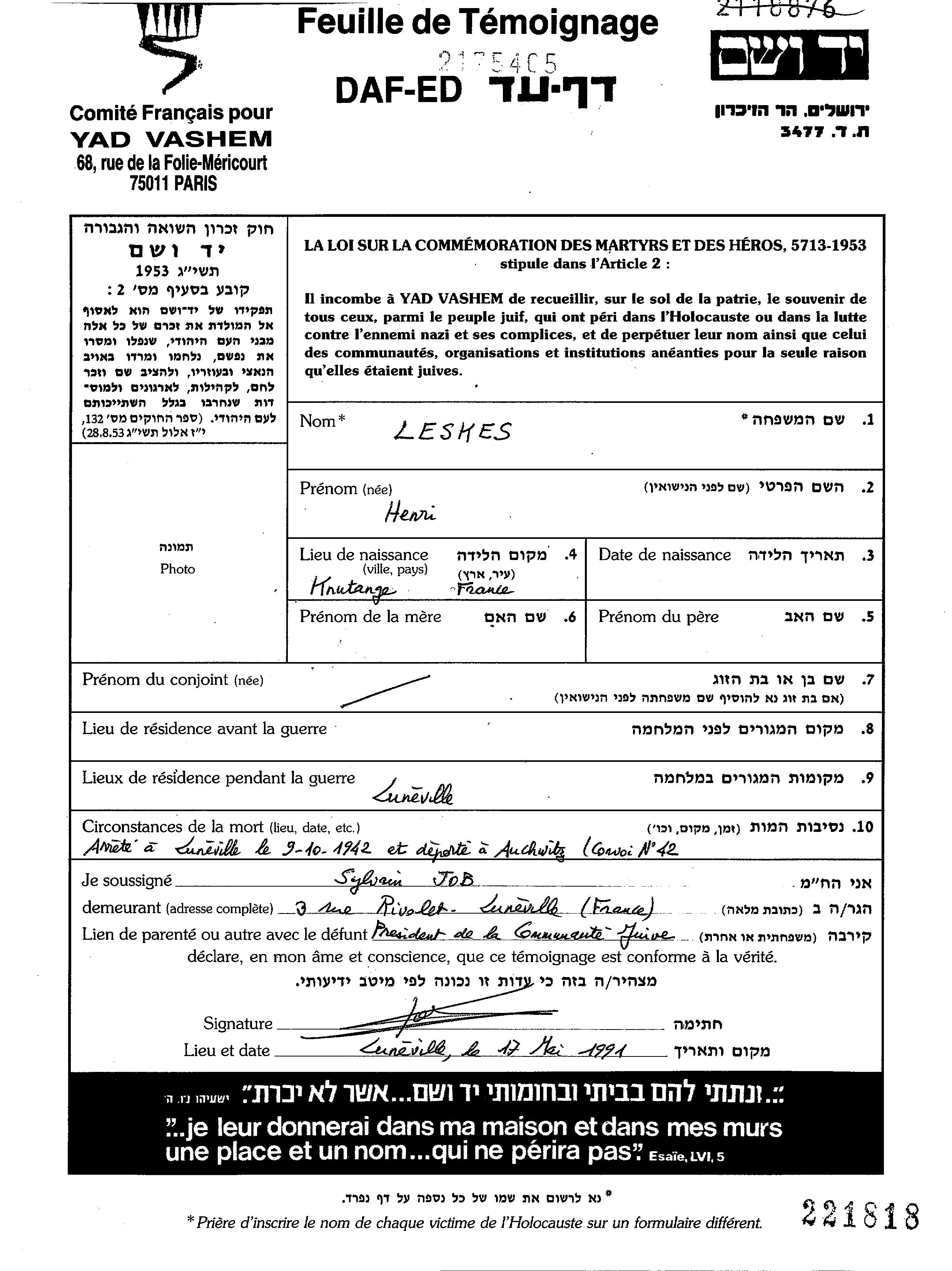 Henri Leskes was born in Kuntange to Samuel and Ruchla nee Adlerfliger. During the war he was in Luneville, France.