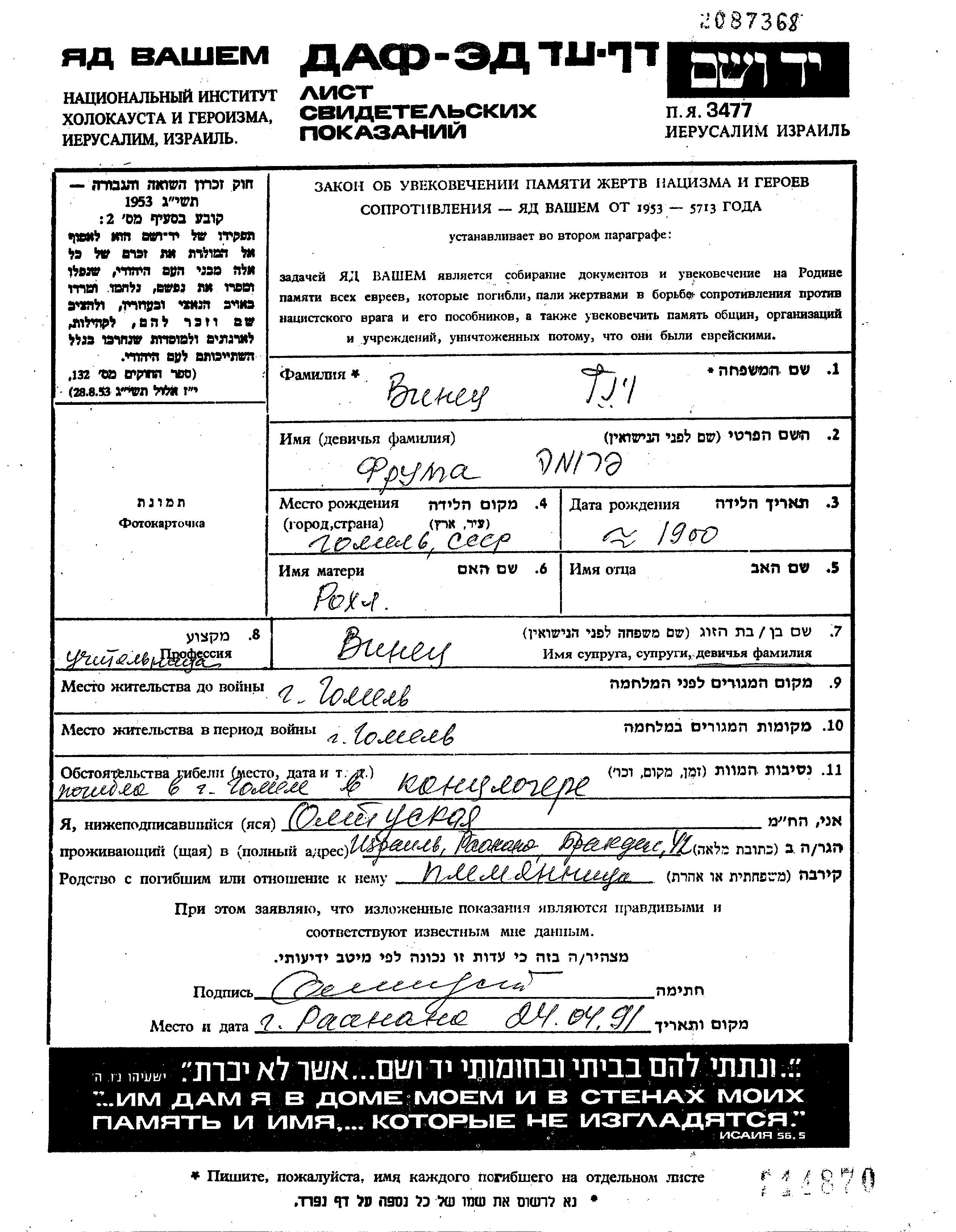 Vinetz Vintz Fruma 1900 Gomel, Belorussia (USSR) Page of Testimony