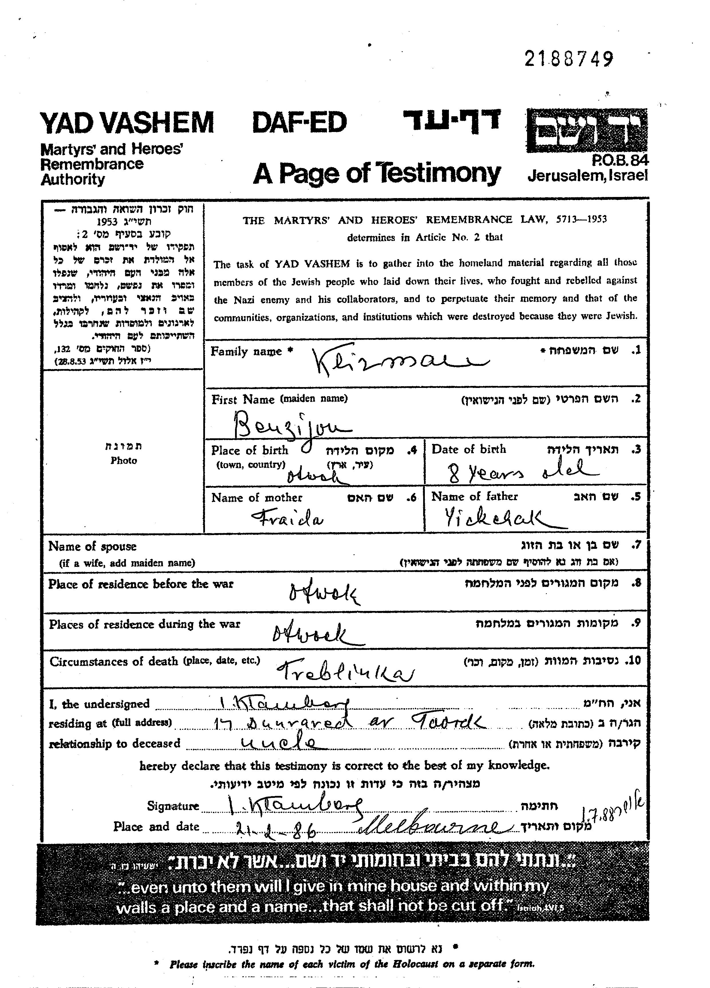 Keizman Benzijon Otwock, Poland Page of Testimony