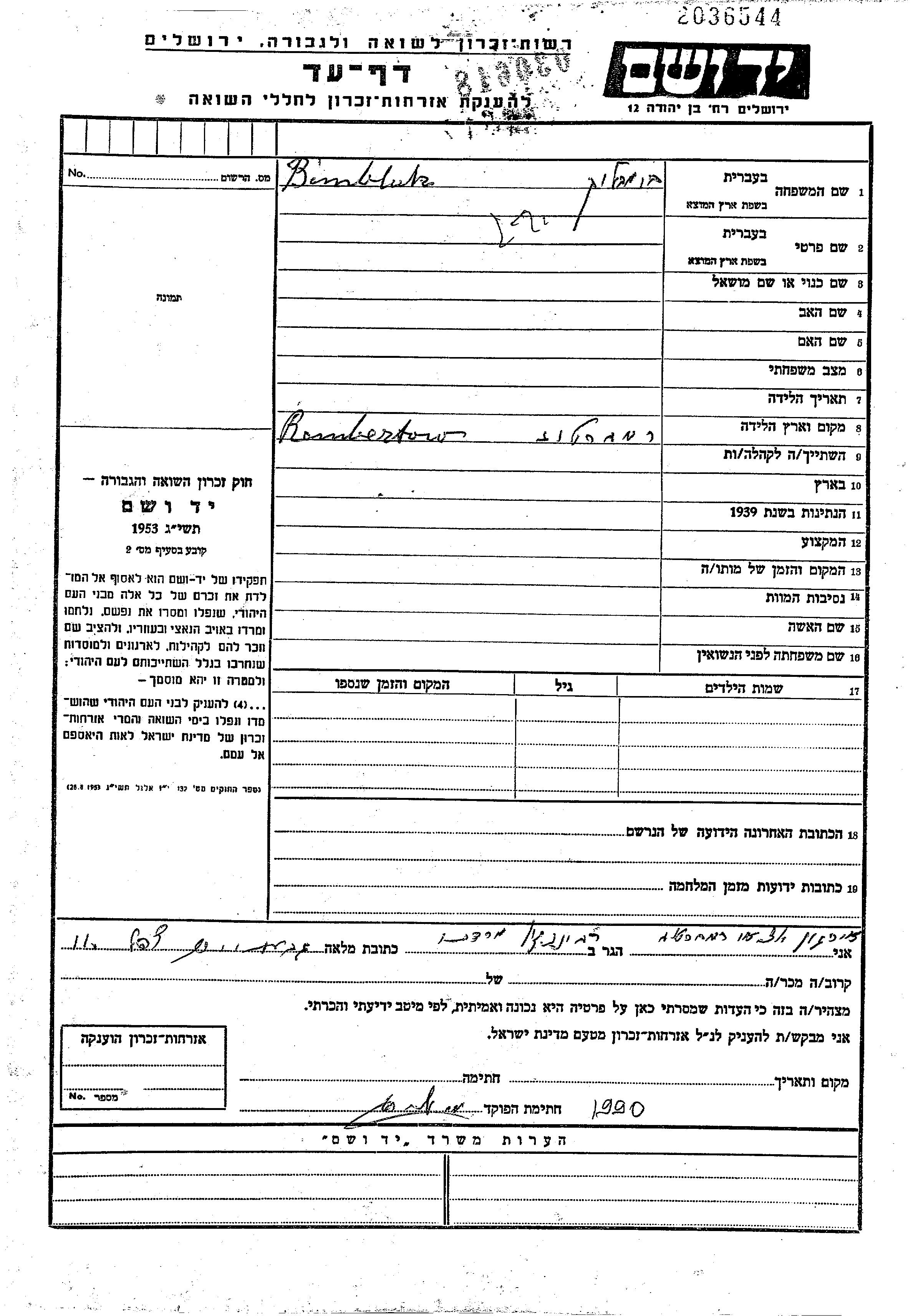 Bimbluk First name unknown Rembertow, Poland Page of Testimony