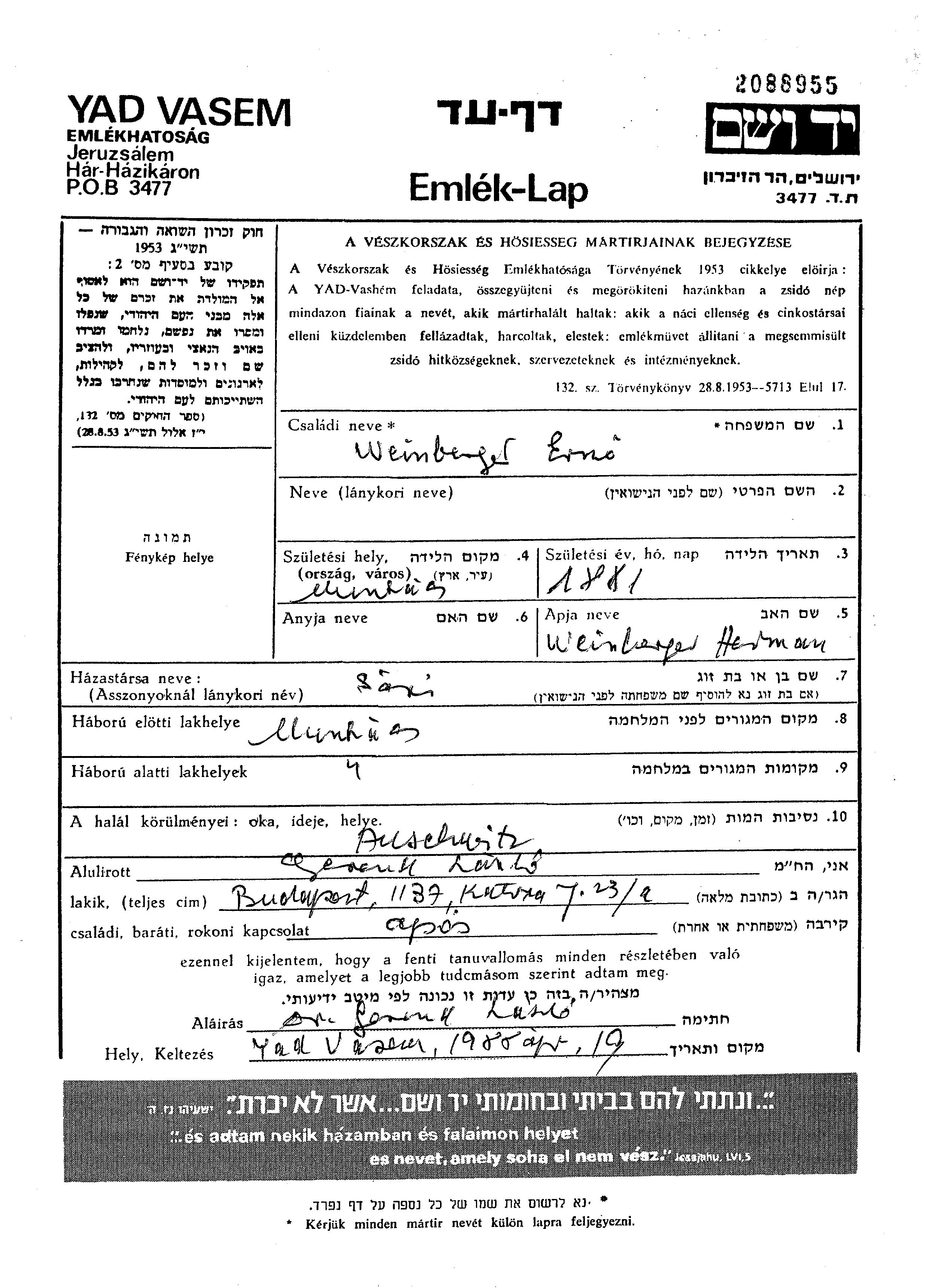 Weinberger Erno 1881 Munkacs, Czechoslovakia Page of Testimony