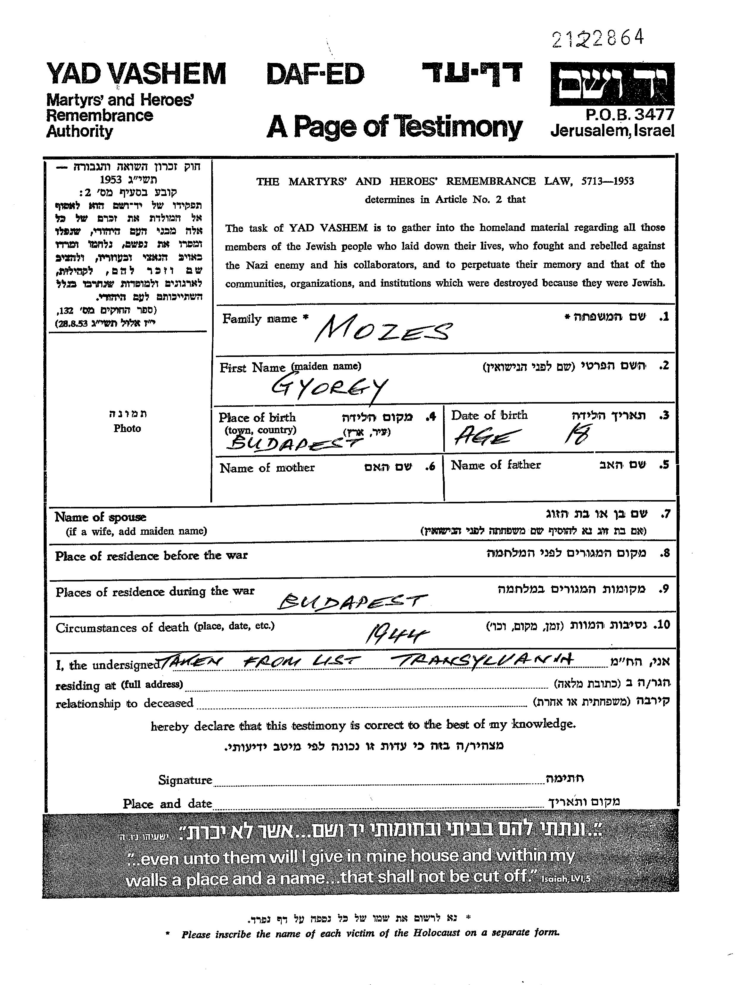 Mozes Gyorgy 1926 unstated place, Page of Testimony