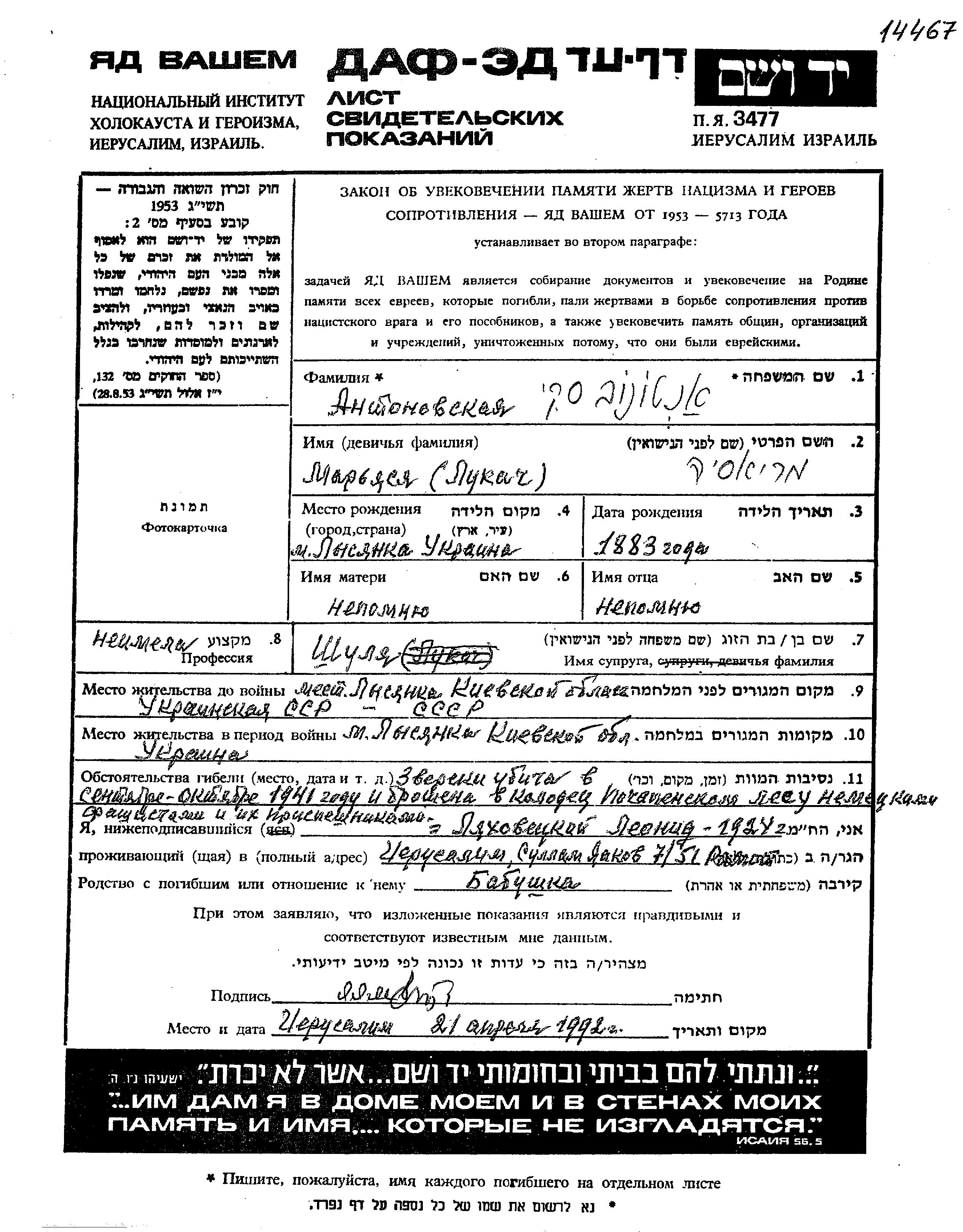 Mariasia Antonovski nee Lukach was born in Lysyanka, Ukraine (USSR), 1883. She was married to Shulia Shulia. Prior to WWII she lived in Lysyanka, Ukraine (USSR). During the war she was in Lysyanka, Ukraine (USSR). Mariasia was murdered in the Shoah. Place of death: Pochapintsy, Ukraine (USSR), 1941.