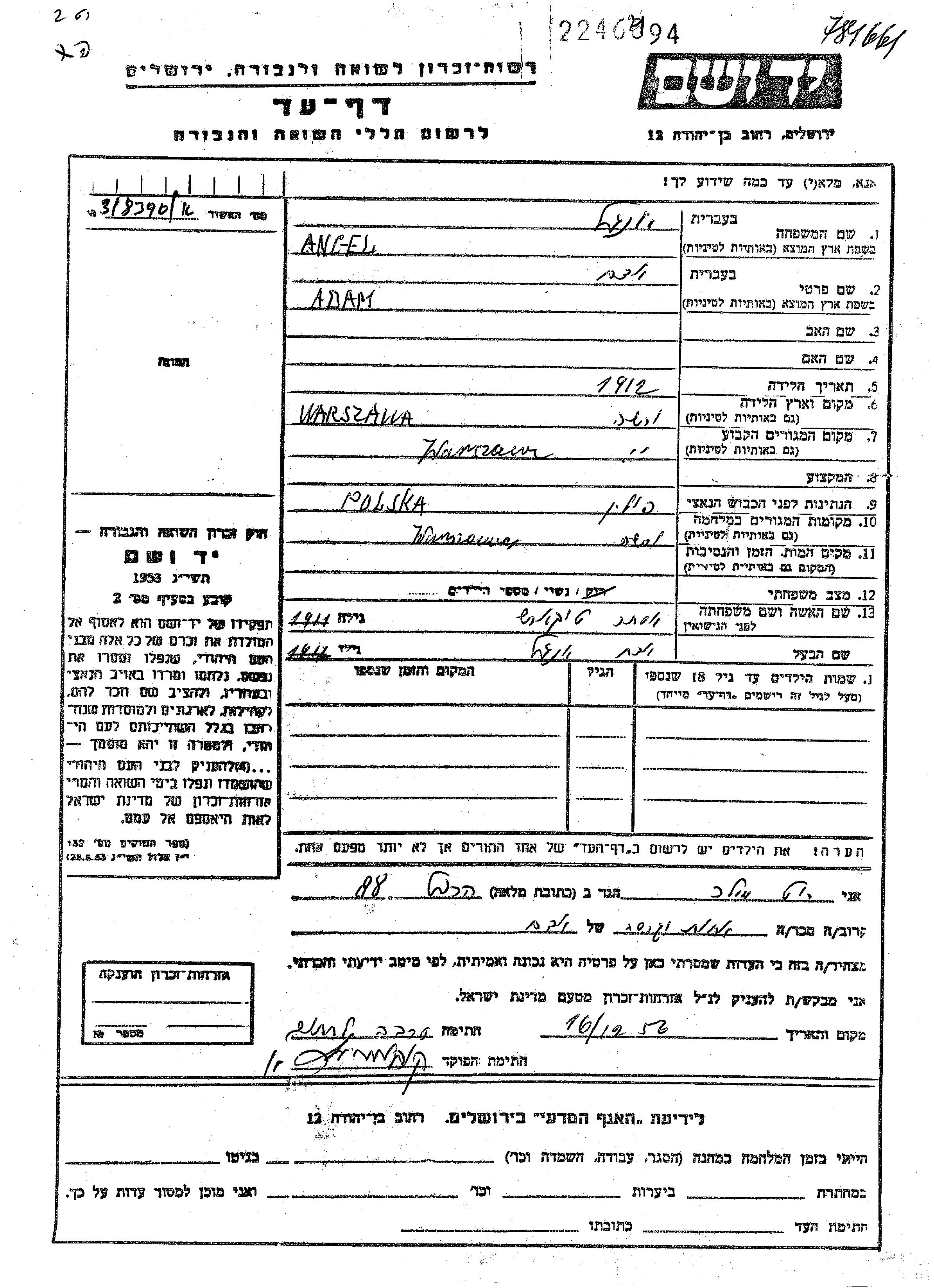 Angel Adam 1912 Warszawa, Poland Page of Testimony