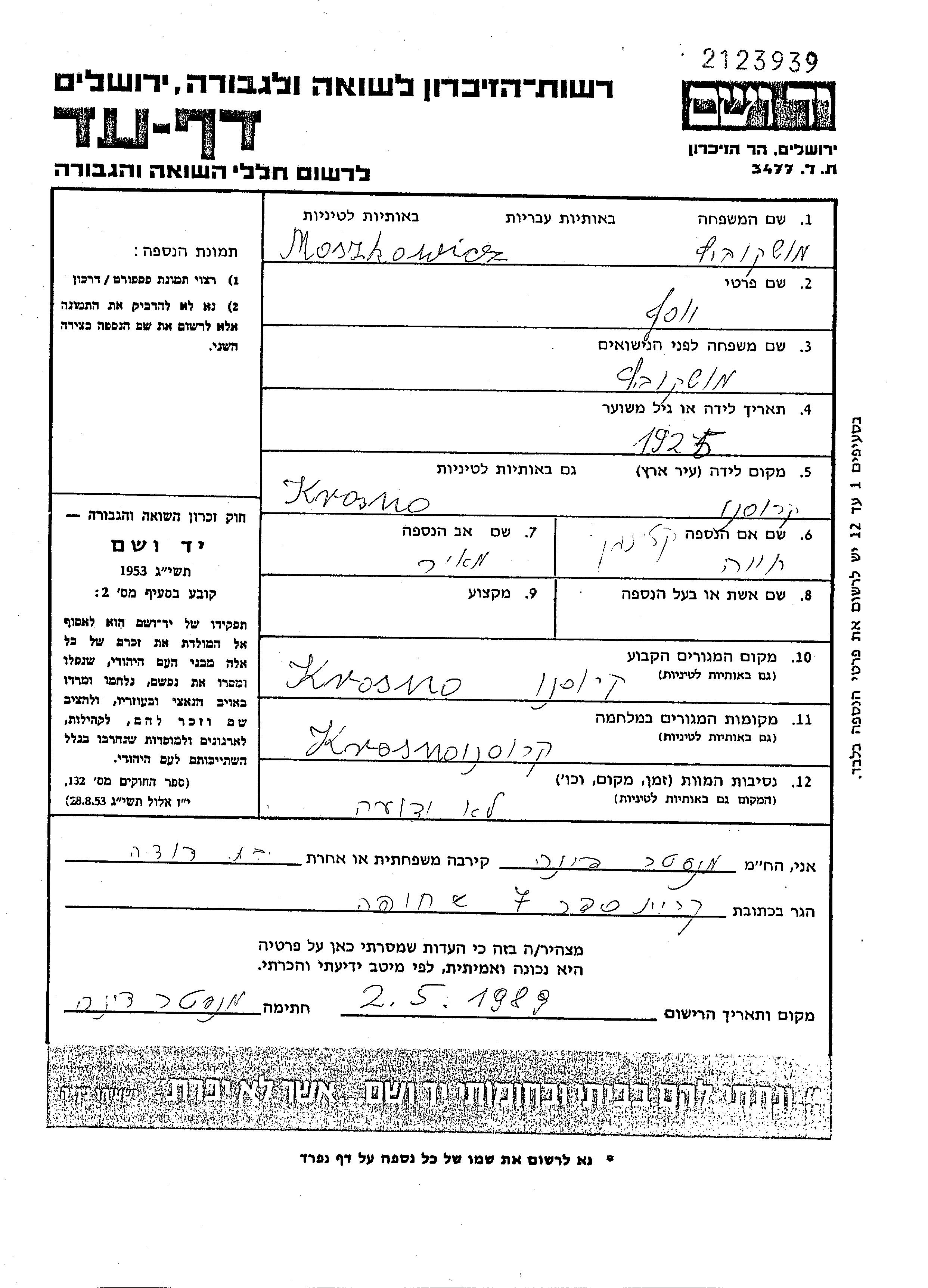 Moszkowicz Yosef 1925 Krosno, Poland Page of Testimony