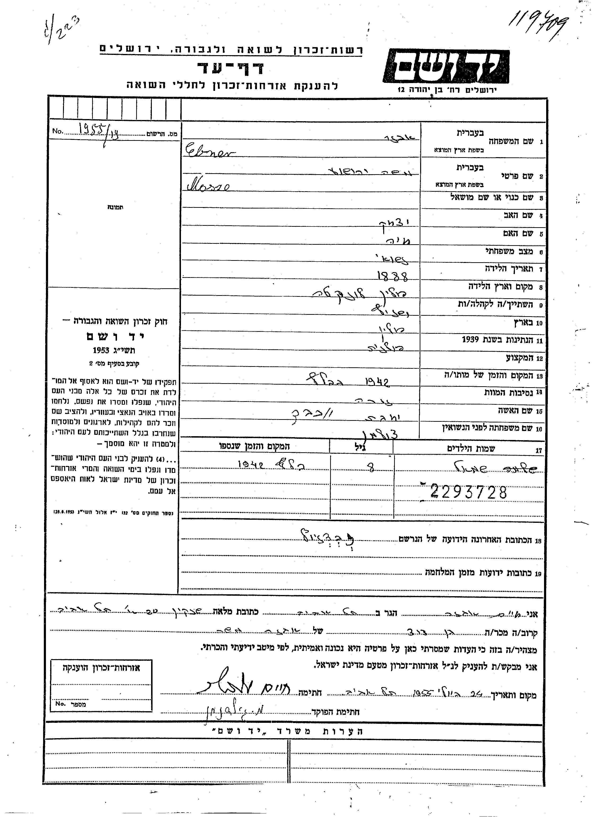 Shmuel Ebner Avner was born in Lakta, Poland, 1934 to Mosze Yehoshua and Jochewet nee Tzolman. He was child. Prior to WWII he lived in Wisznicz, Poland. During the war he was in Zabierzow, Poland. Shmuel was murdered in the Shoah. Place of death: Belzec, Poland, 1942.
