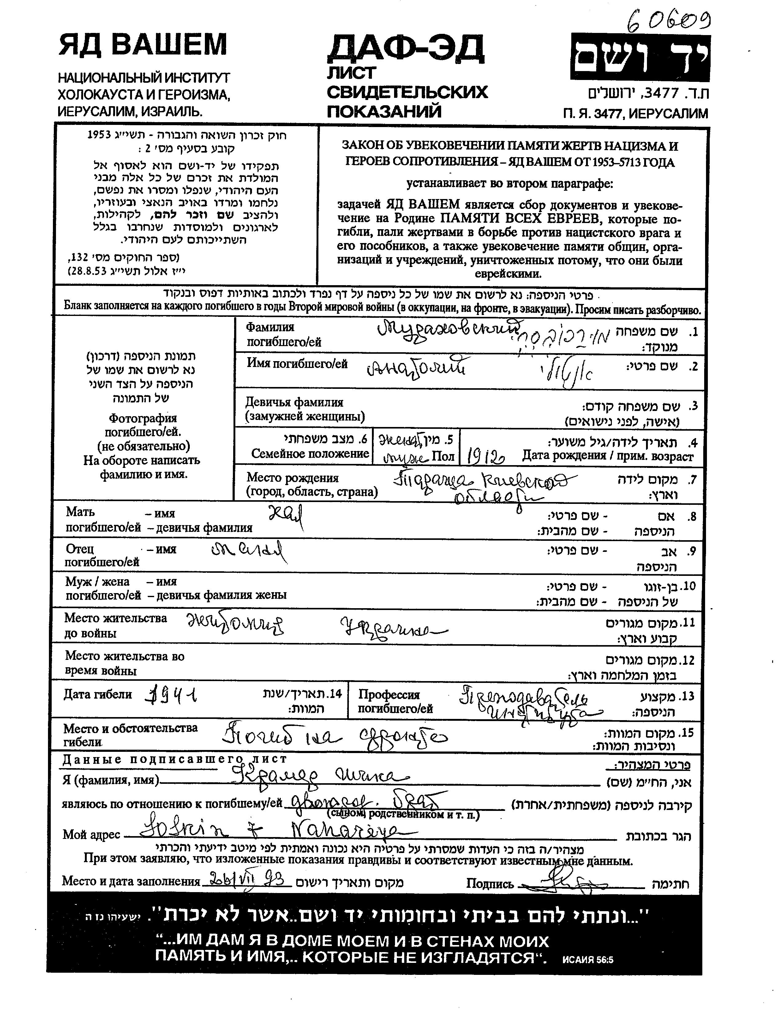 Anatoli Murakhovski was born in Tarashcha, Ukraine (USSR), 1912 to Mania and Khaia. He was a pedagogue and married. Prior to WWII he lived in Zhitomir, Ukraine (USSR). During the war he was in the Soviet armed forces. Anatoli was killed in military service in WWII. Place of death: the armed forces, 1941.