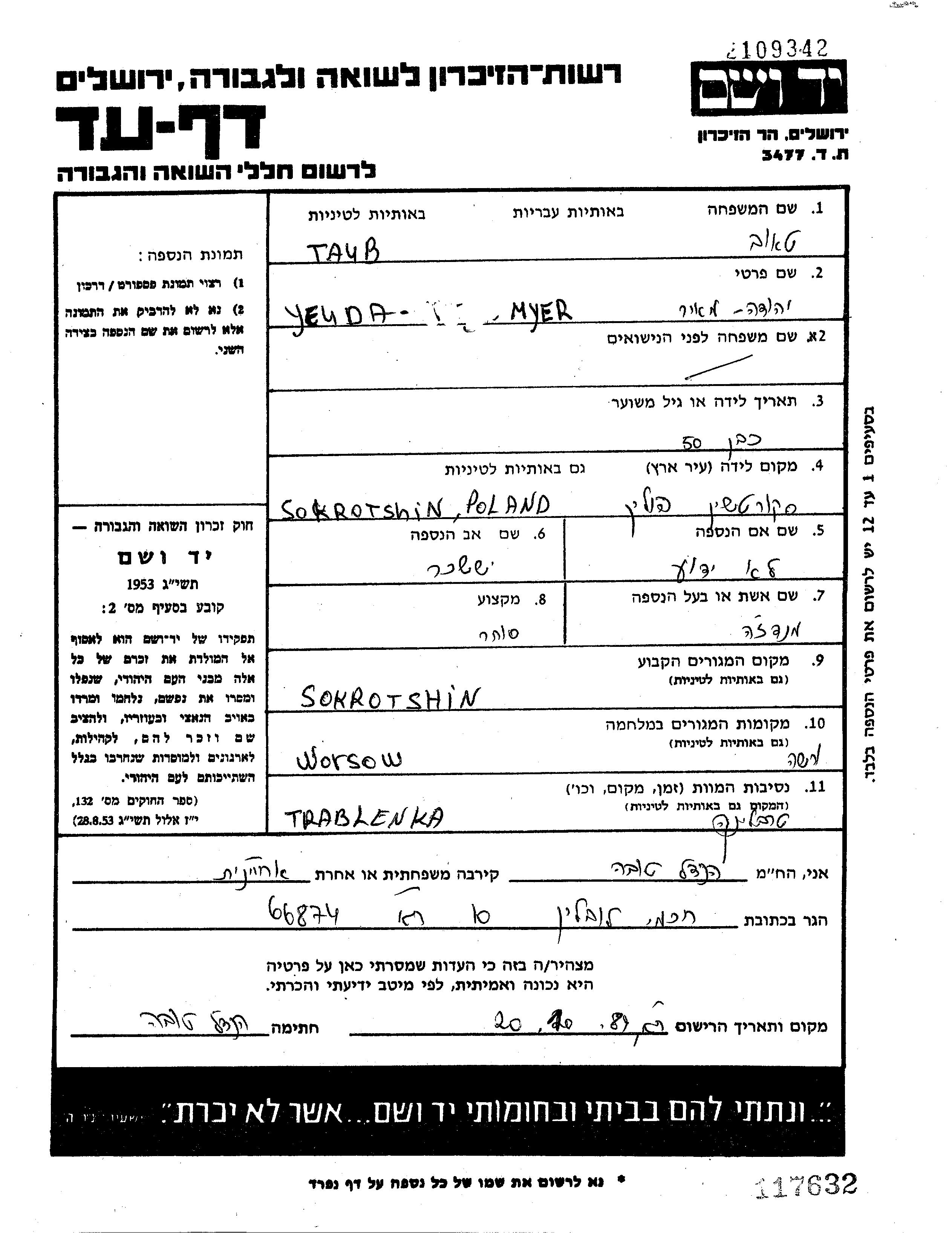 Taub Yeuda Myer Sochocin, Poland Page of Testimony