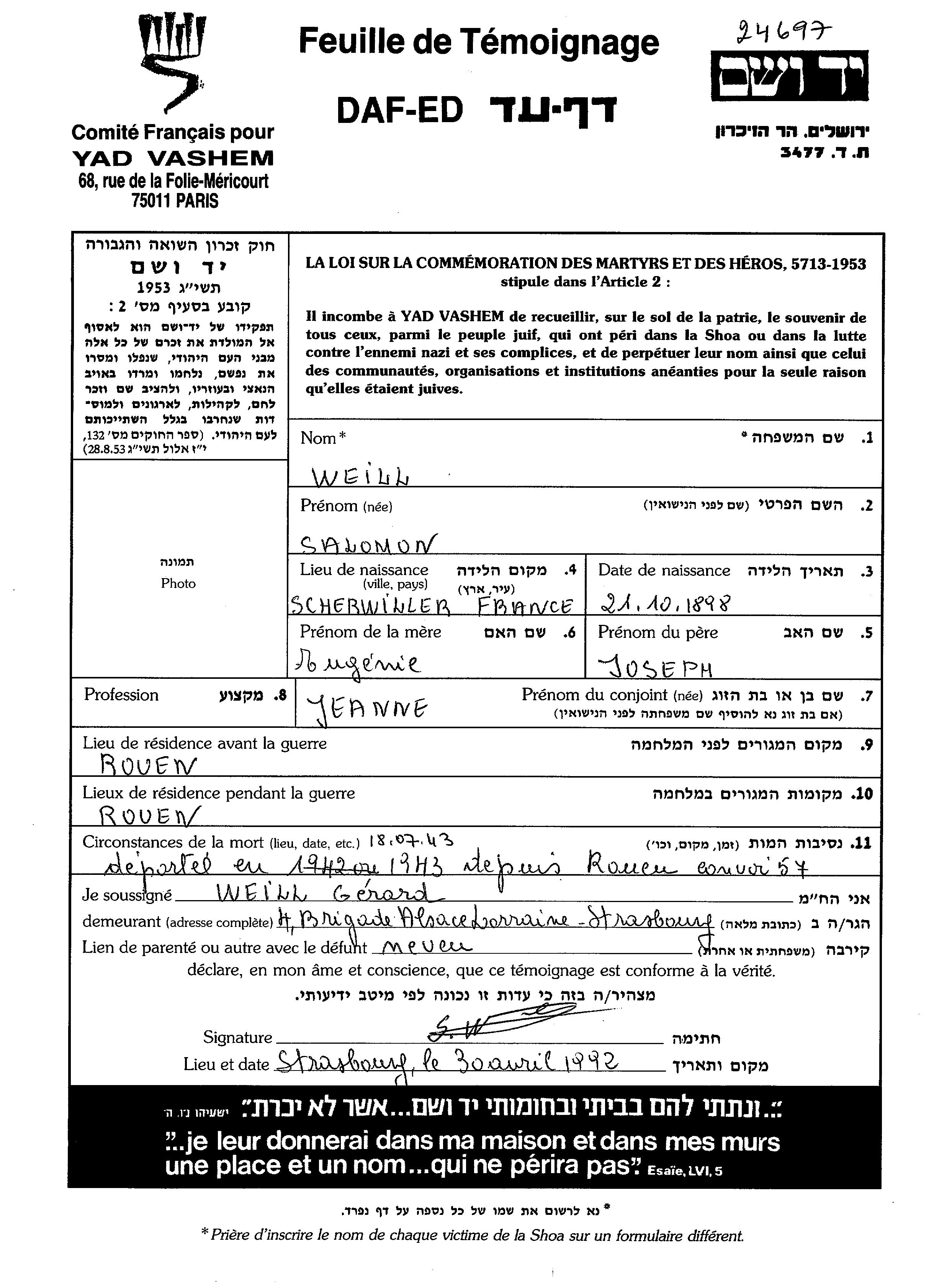 Salomon Weill was born in Scherwiller, France, 1898 to Joseph and Eugenie Eugen. He was married to Jeanne Zhan. Prior to WWII he lived in Rouen, France. During the war he was in Rouen, France.
