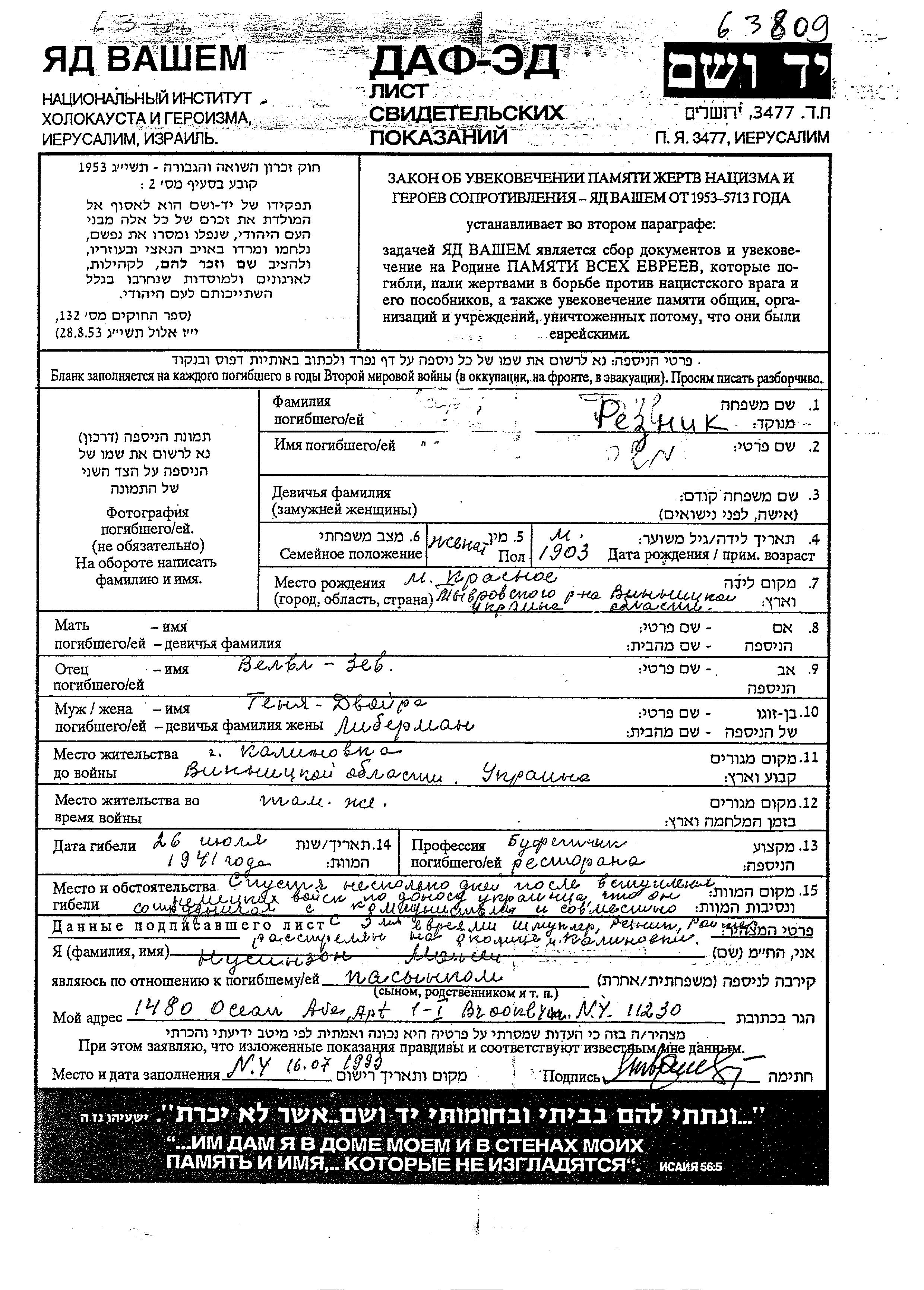 Reznik First name unknown Kalinovka, Ukraine (USSR) Page of Testimony